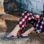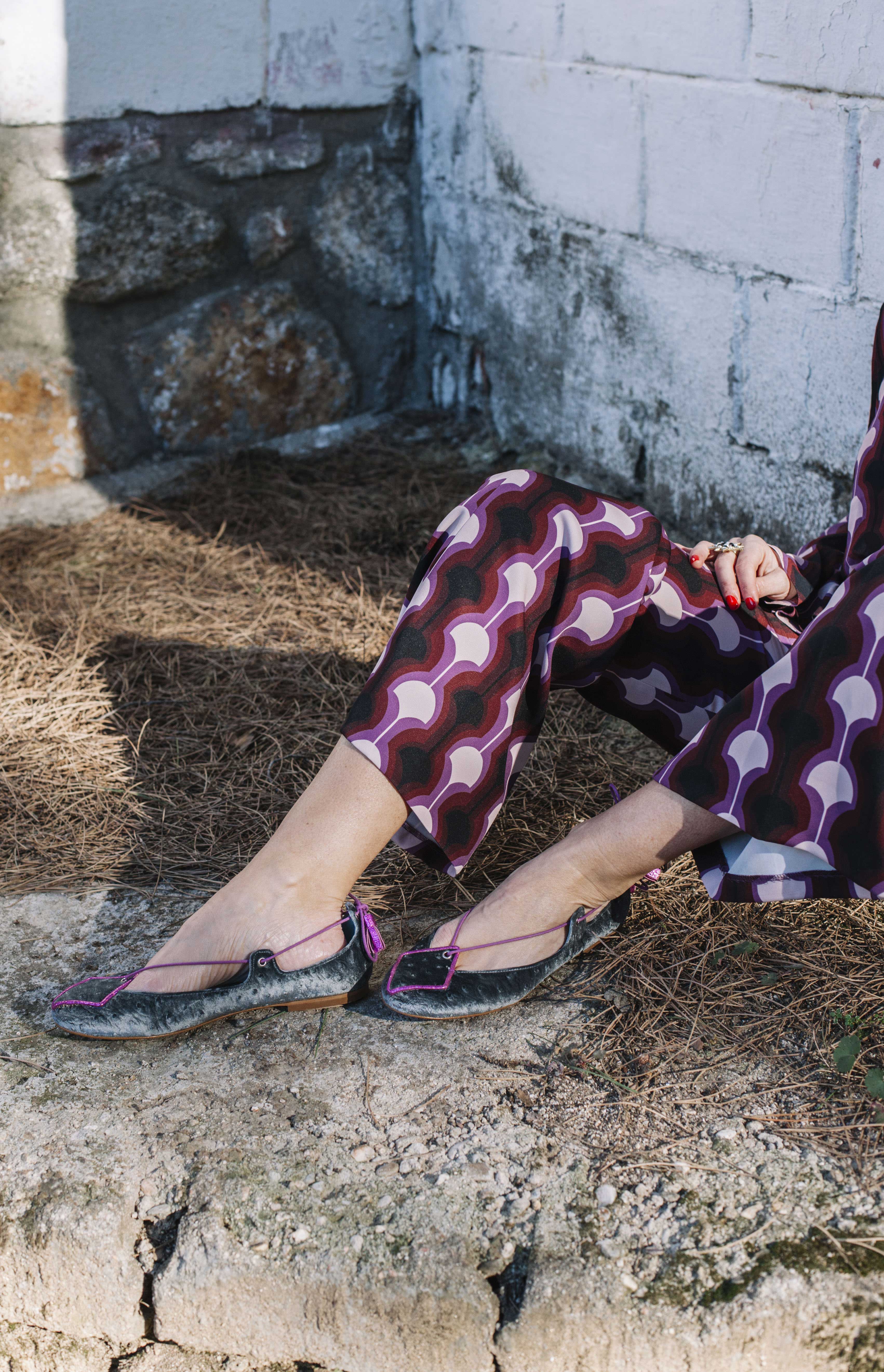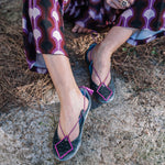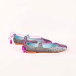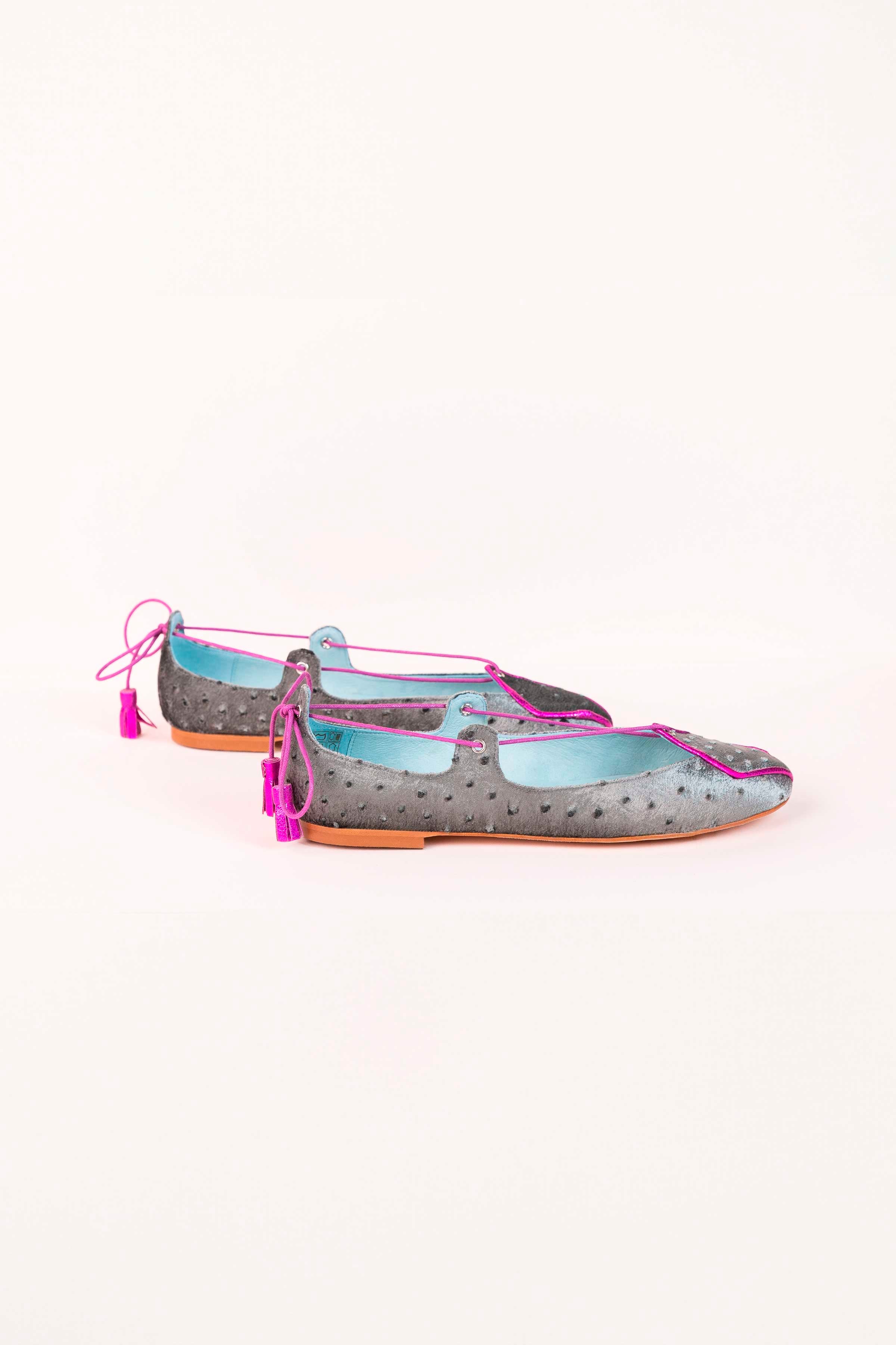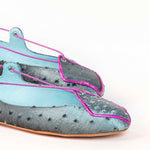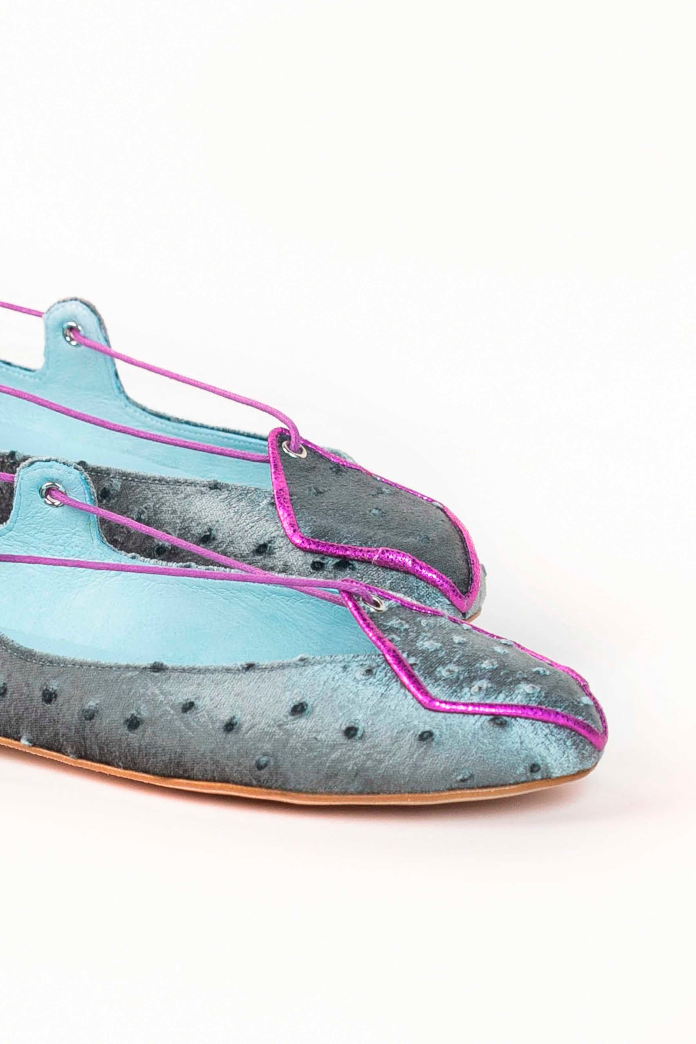Ballerine plate à bout semi-rond en velours de soie turquoise avec gravure autruche, fermeture par nœud à l'arrière terminée par des franges en nappa brillant. Détail géométrique sur l'encolure à bordure contrastée. Tous nos modèles disposent d'une cale interne de 1,5 cm. Intérieur 100% cuir. Semelle en cuir. Modèle exclusif defloresyfloreros, conçu et fabriqué en Espagne.