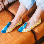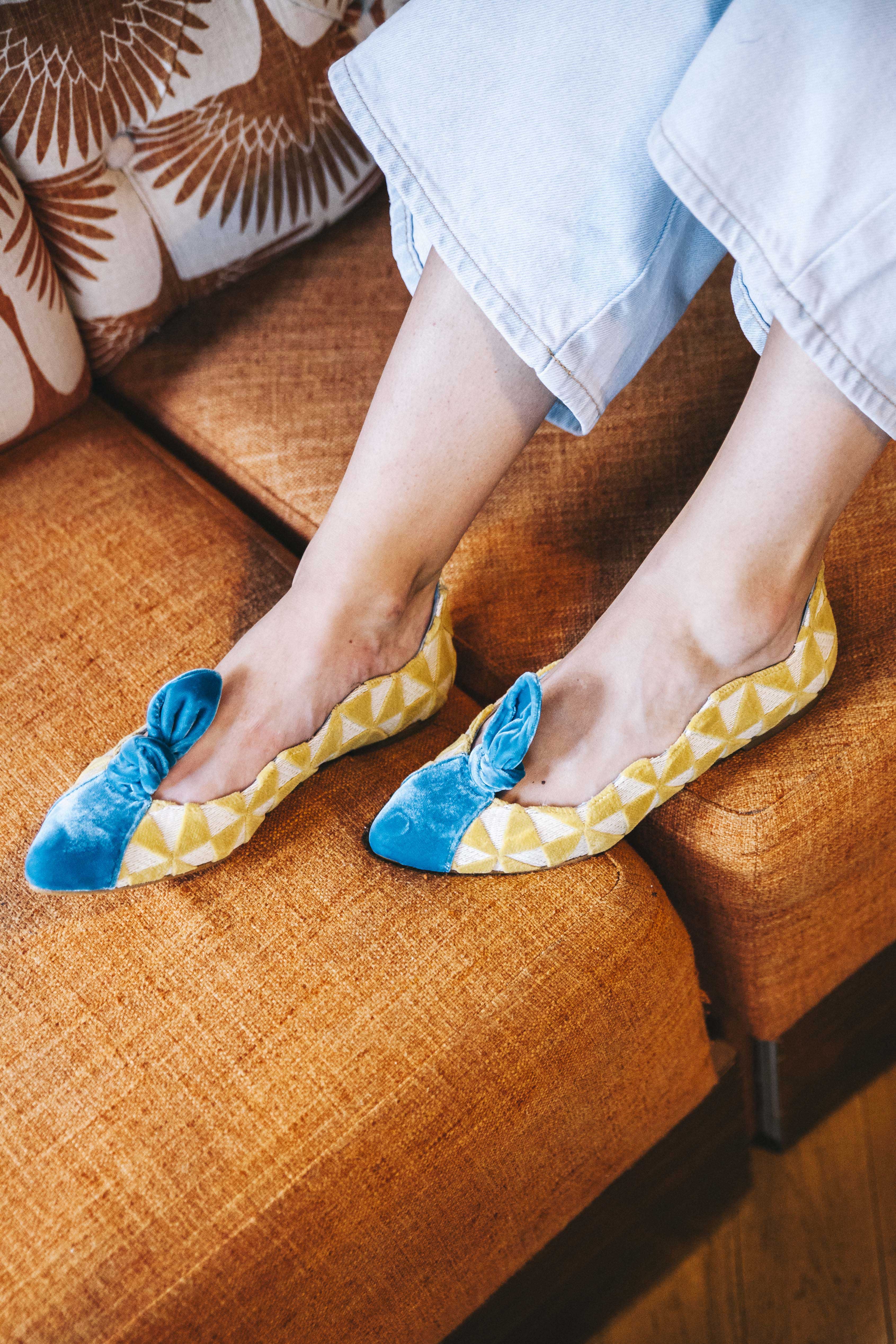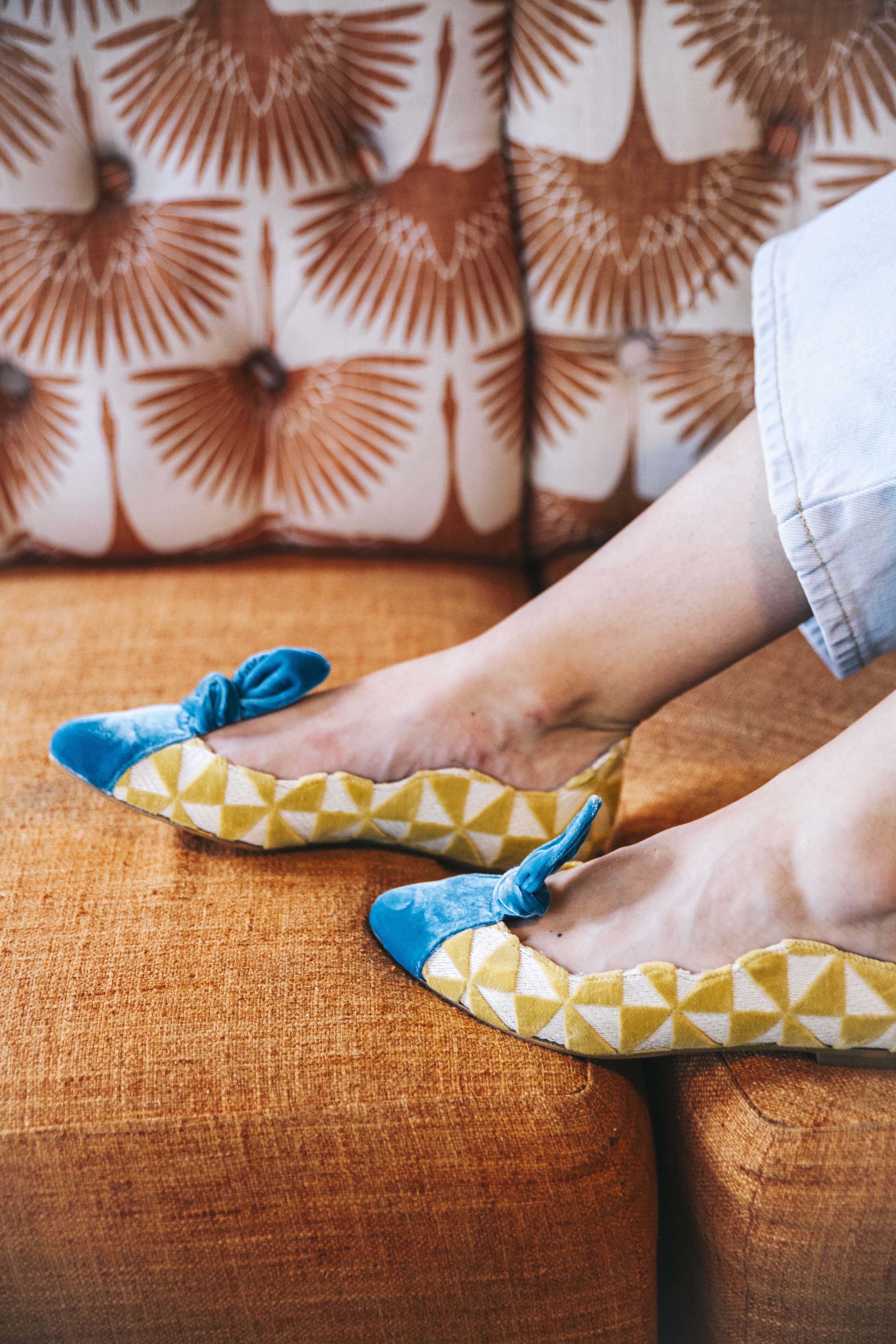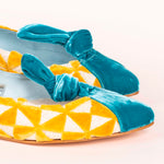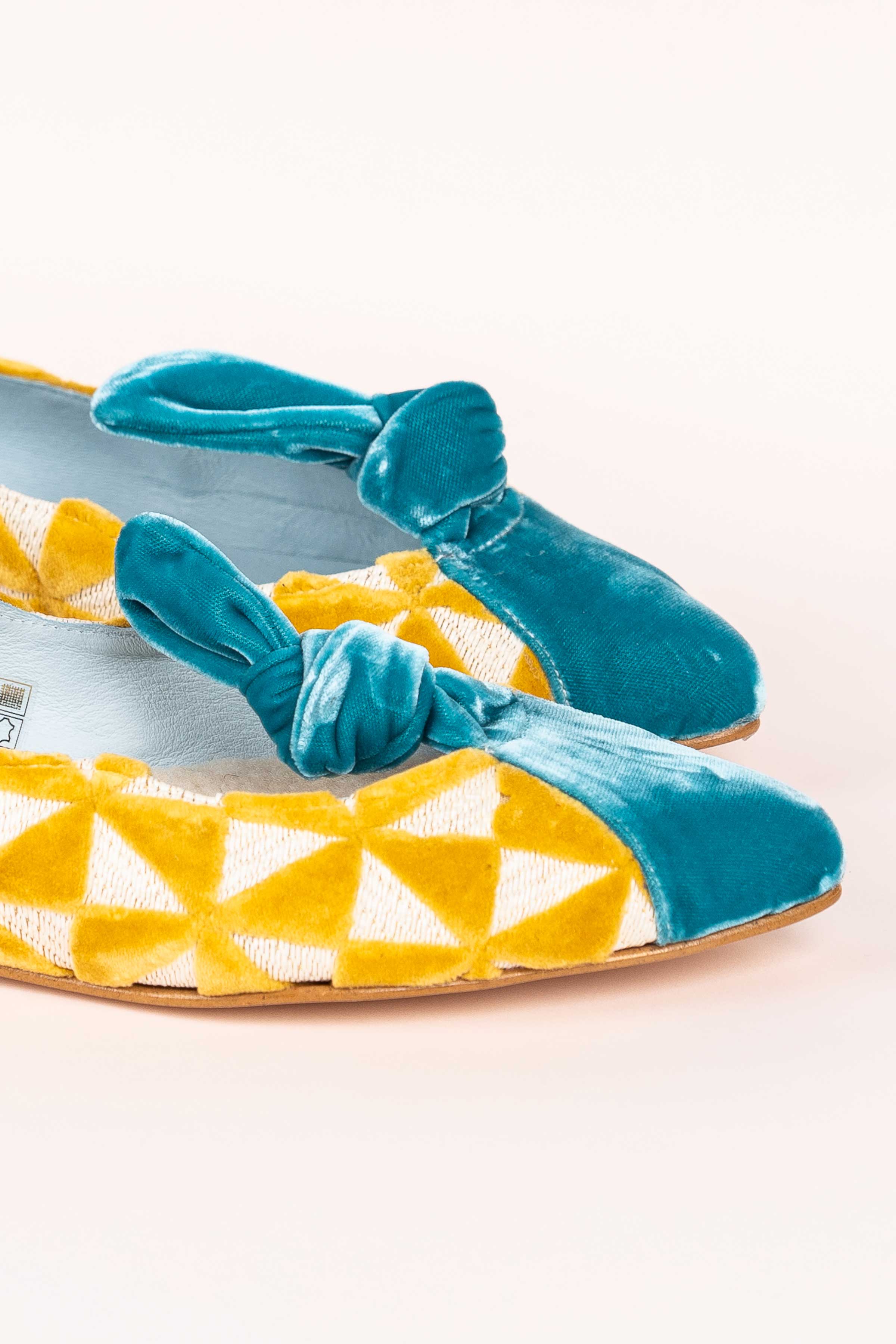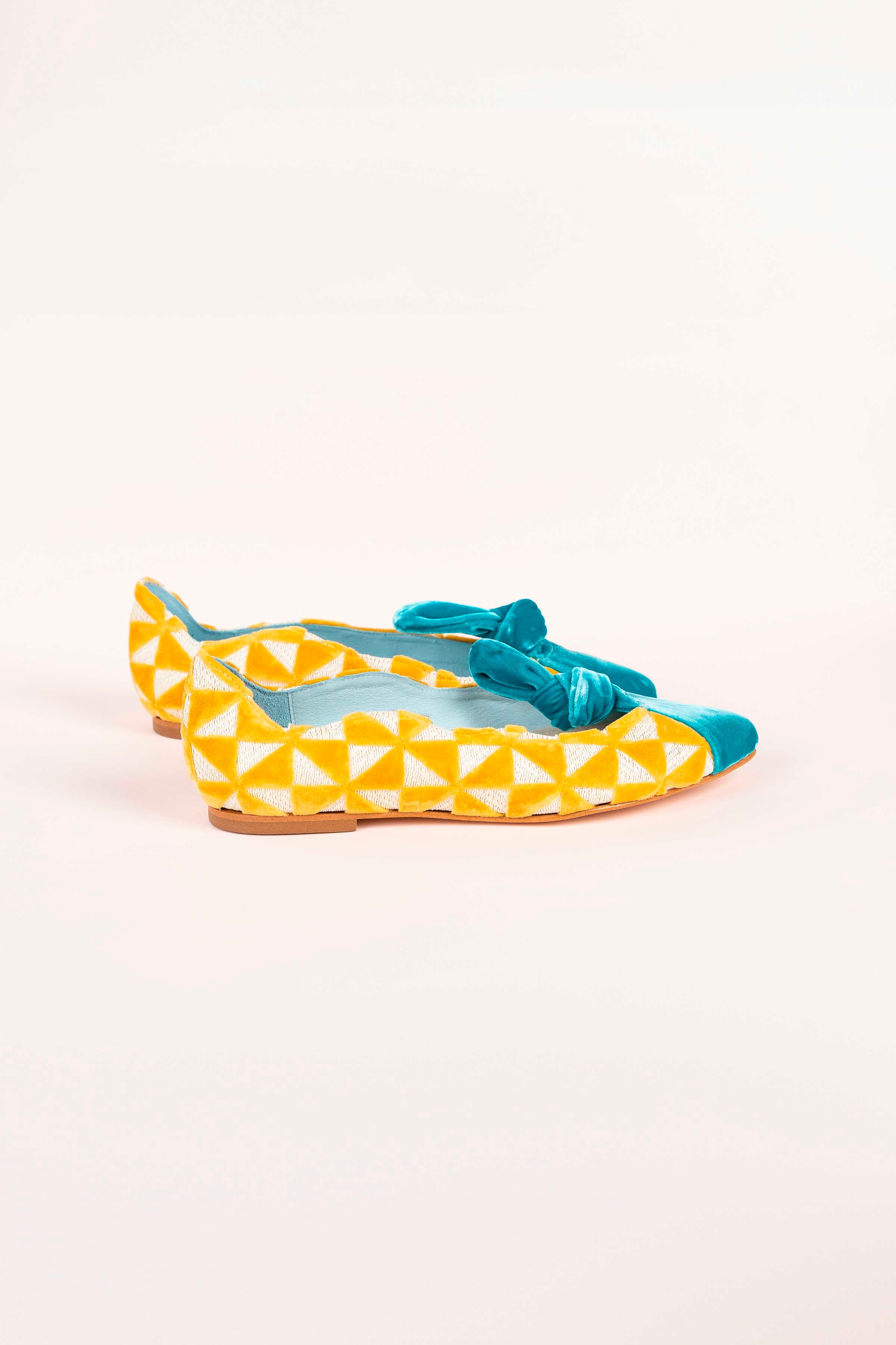 Ballerine plate sur base en tissu tapisserie réalisant des dessins triangulaires. Embout contrasté en velours de soie • SEMELLE INTERCHANGEABLE • Fabriquée en Espagne. Tous nos modèles disposent d'une cale interne de 1,5 cm. Intérieur 100% cuir. Semelle en cuir. Modèle exclusif defloresyfloreros, conçu et fabriqué en Espagne.
