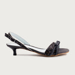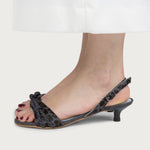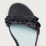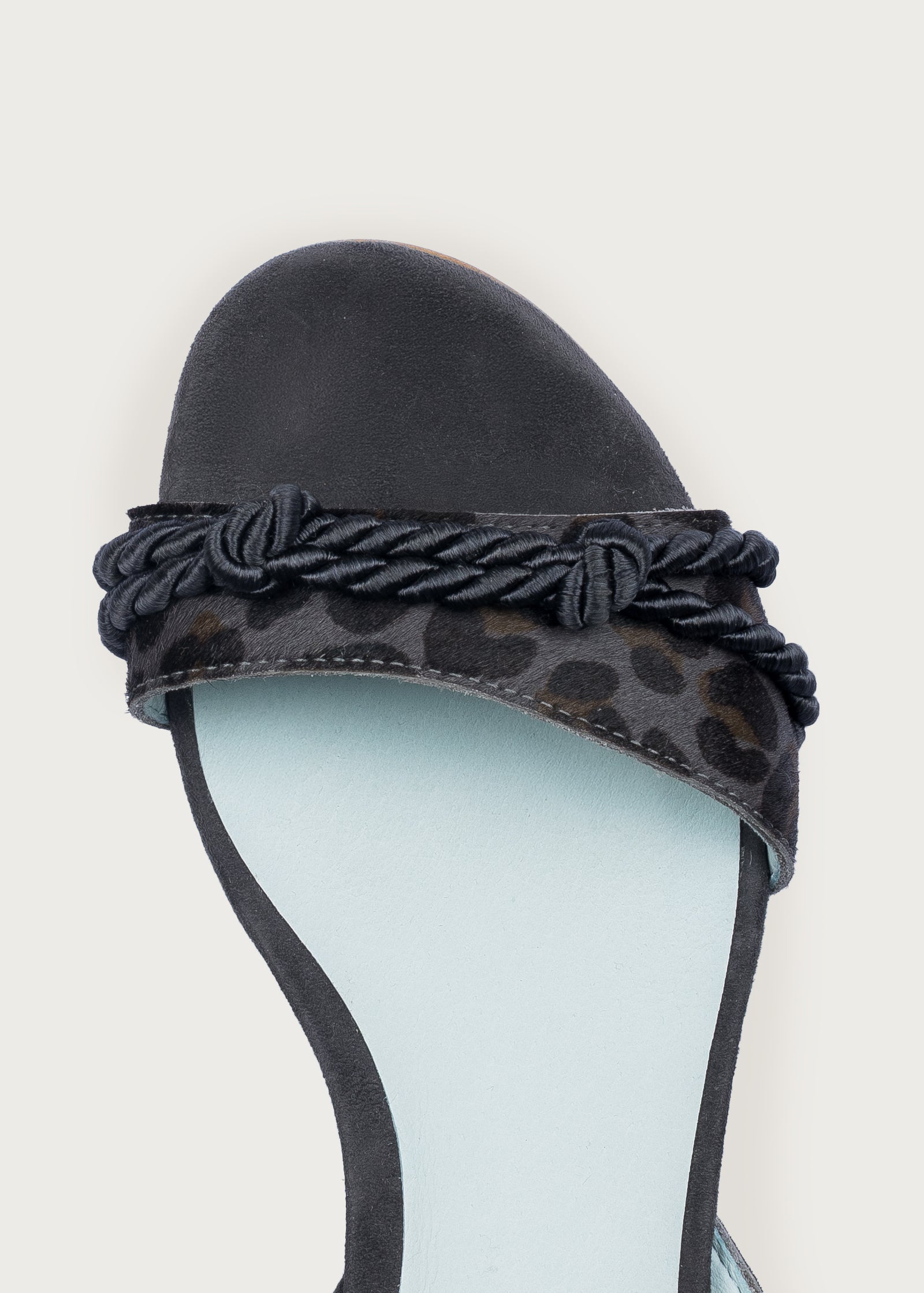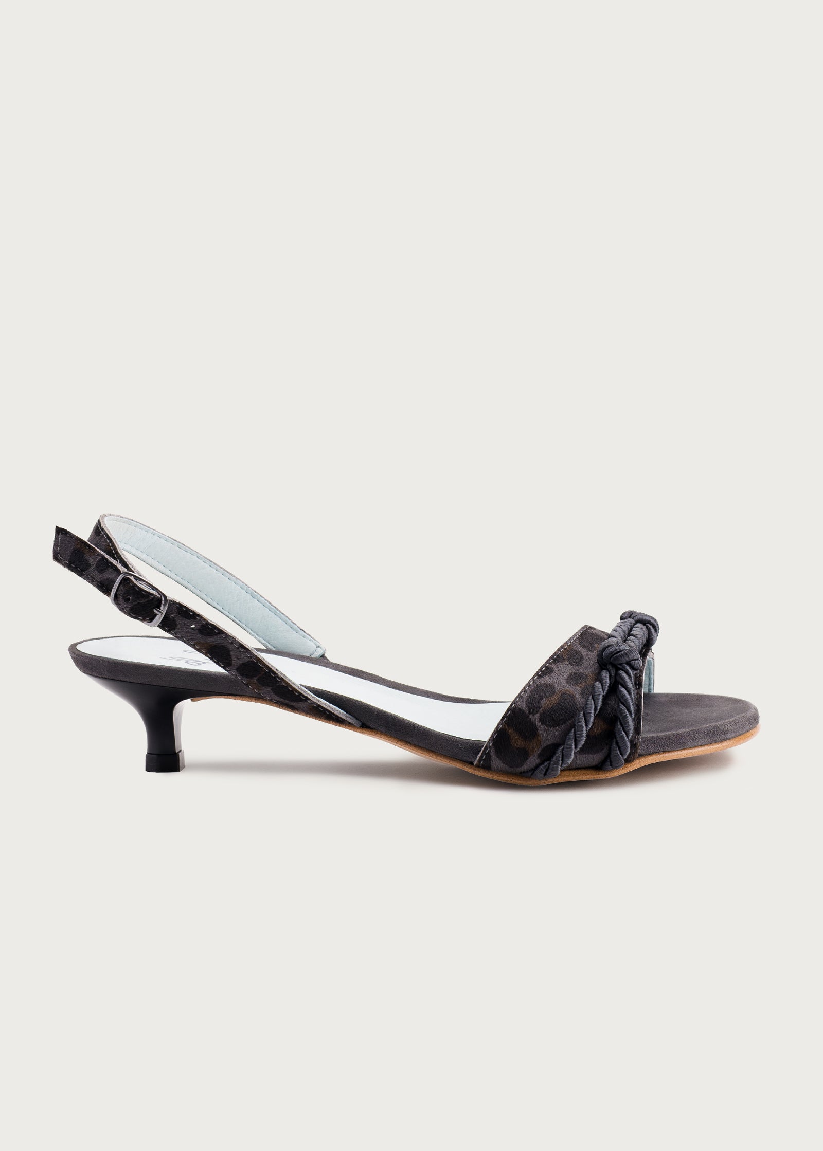 Son design se distingue par la combinaison de différentes finitions, où l'imprimé animal se mêle à un cordon artisanal qui parcourt la tige en apportant texture et personnalité. La bride arrière réglable permet d’ajuster l’ajustement avec confort, tandis que son talon bobine de 2,5 cm offre une légère élévation qui affine sans renoncer au confort.