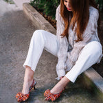 Miguel Ángel est un talon coquet ouvert à l'arrière en raso imprimé dans des tons orange avec un double nœud du même matériau. Ce design est parfait pour toute occasion : jean et chemise ou un événement.