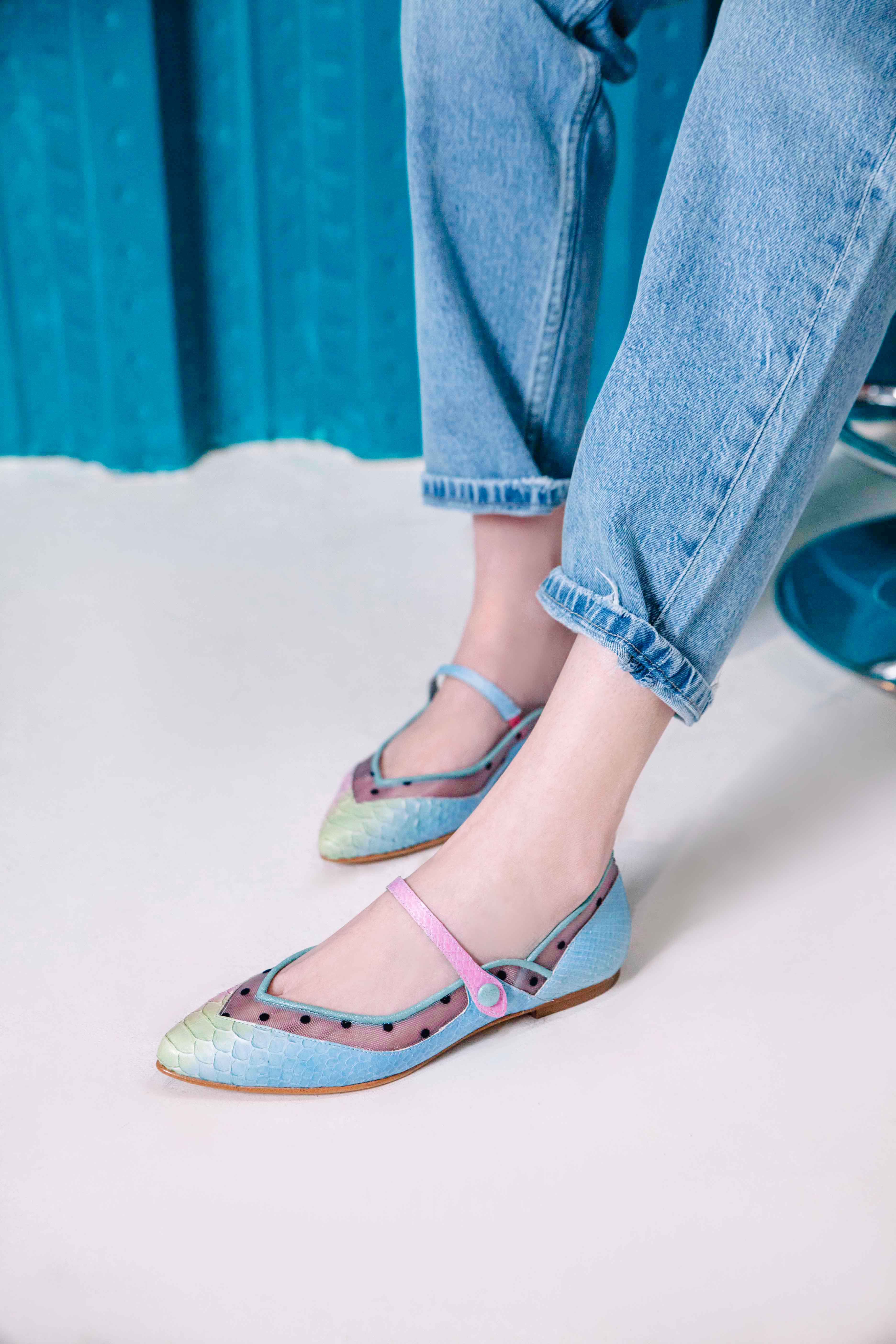 Ballerine en python, peinte à la main avec différents contrastes et tulle à pois combinés ! • SEMELLE INTERCHANGEABLE • Fabriquée en Espagne. Tous nos modèles disposent d'une cale interne de 1,5 cm. Intérieur 100% cuir. Semelle en cuir. Modèle exclusif defloresyfloreros, conçu et fabriqué en Espagne.