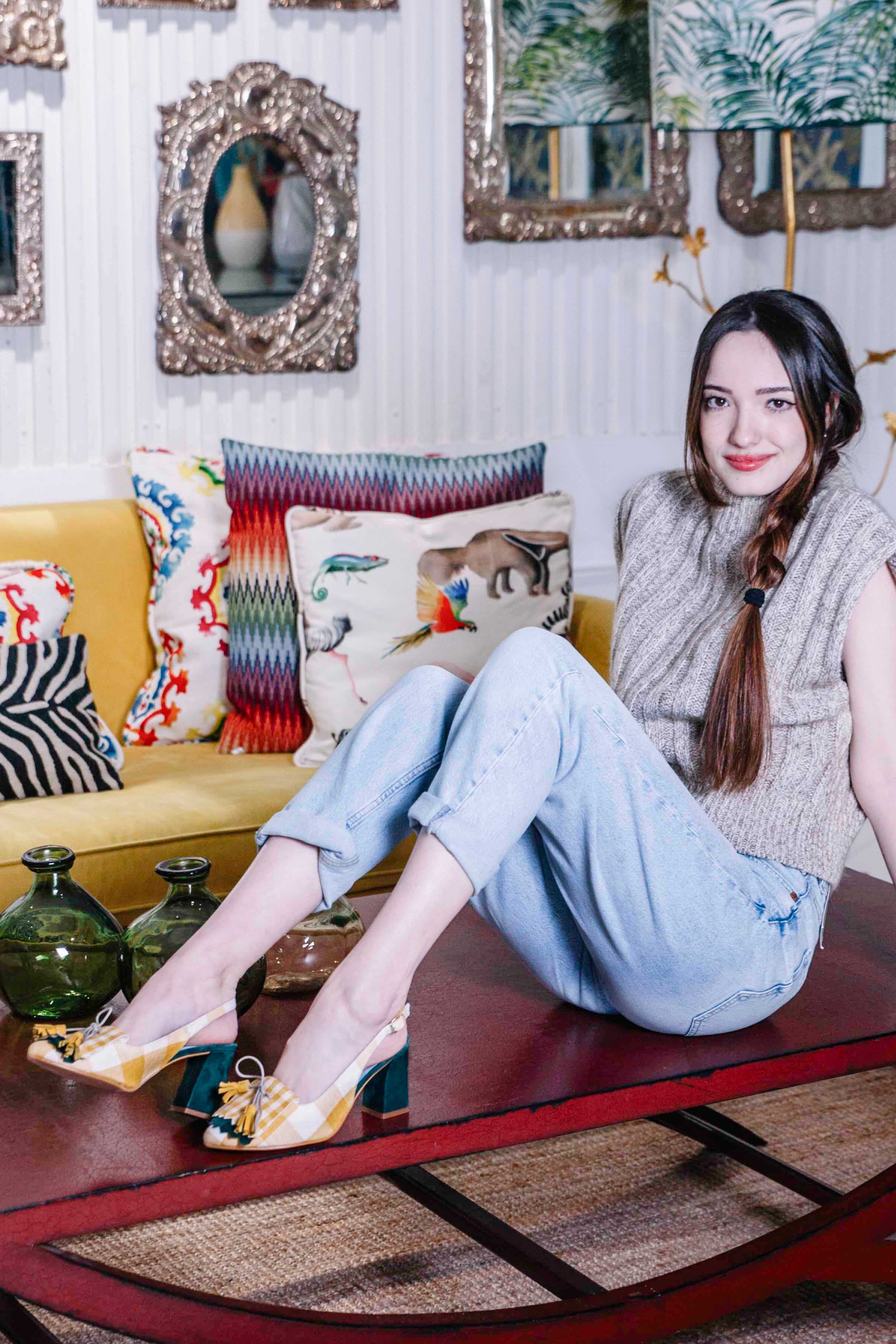 Talon haut de 6,5 cm, bride arrière, languette et fenêtre et tissu gaze à carreaux vichy • INTÉRIEUR EN CUIR BLEU CLAIR • Fabriqué en Espagne. Intérieur 100% cuir. Semelle en cuir. Modèle exclusif defloresyfloreros, conçu et fabriqué en Espagne.