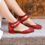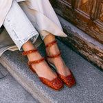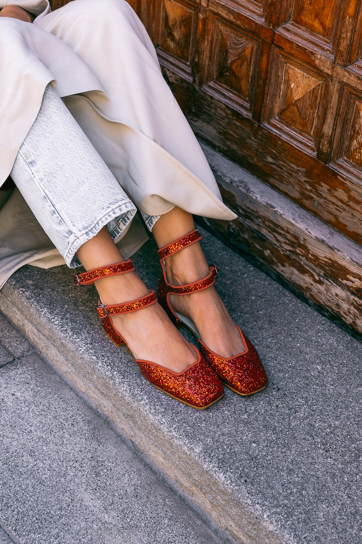 Ballerine con tacco, punta quadrata e glitter. Progettate e prodotte artigianalmente al 100% in Spagna. Altezza 2,5 cm. Realizzate con materie prime di alta qualità, selezionate nei minimi dettagli.