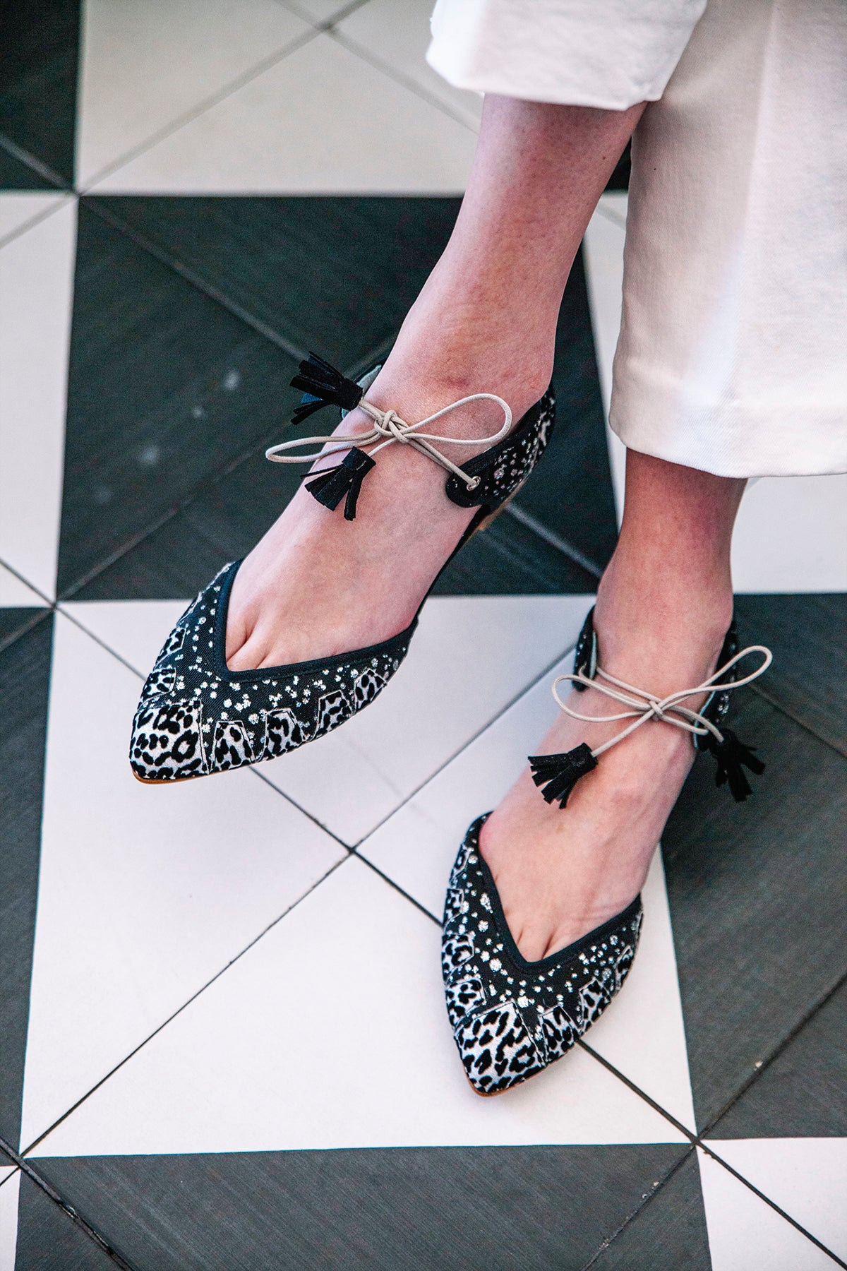 Ballerine con base di rete e pezzi di animal print a contrasto argento e nero. Laccio rotondo beige con nappina abbinata.