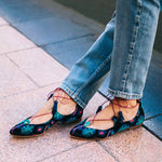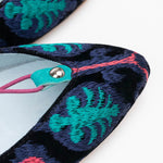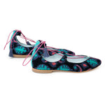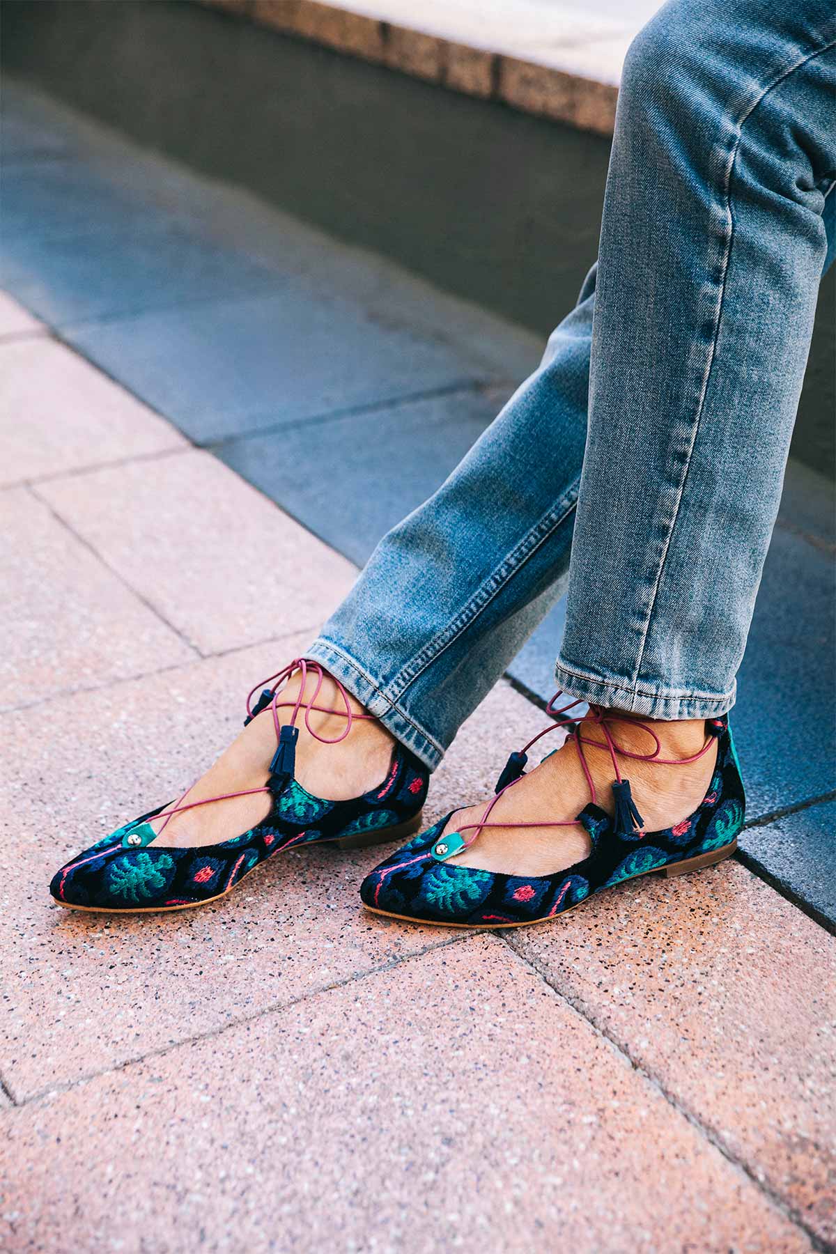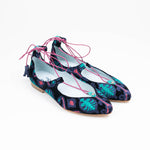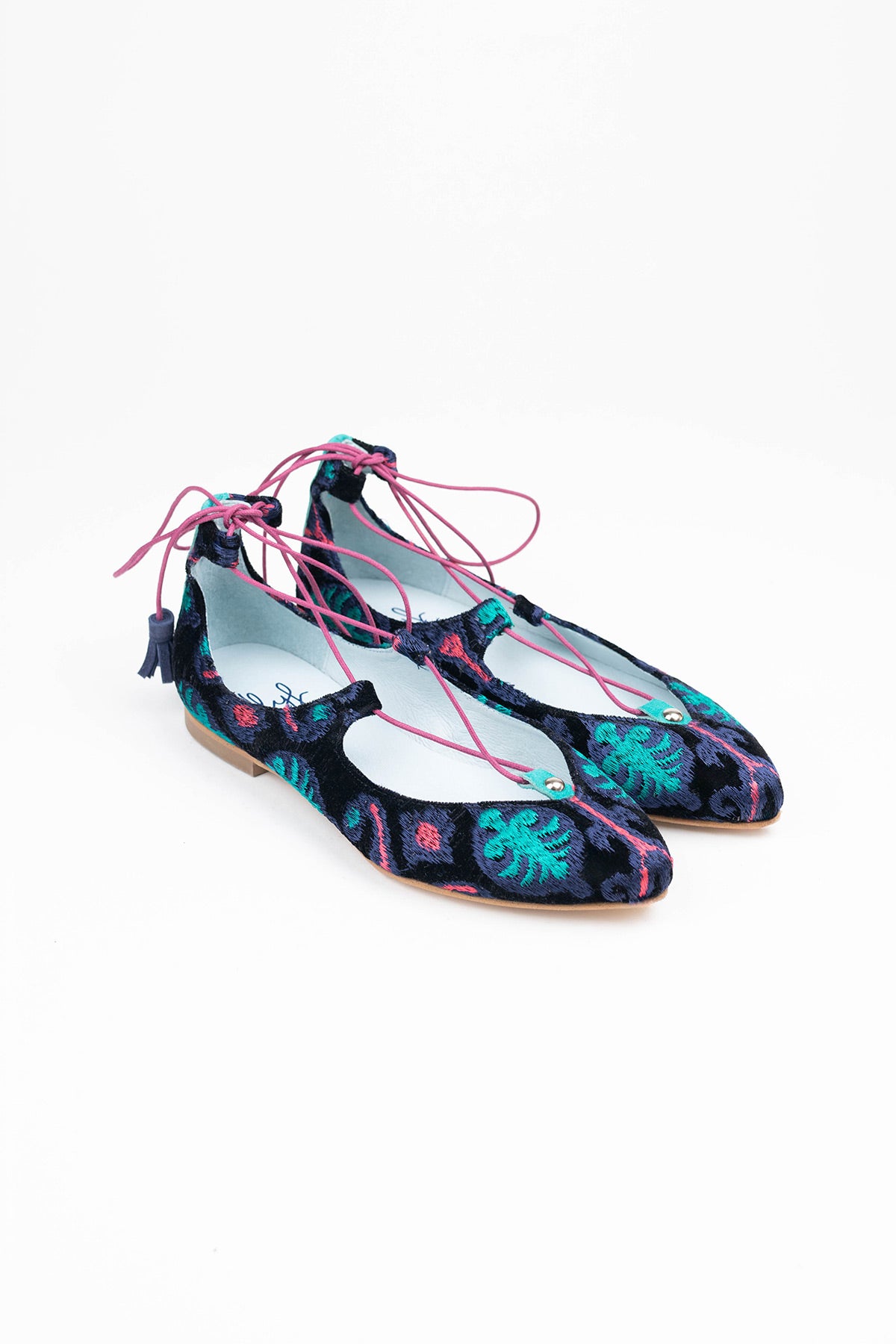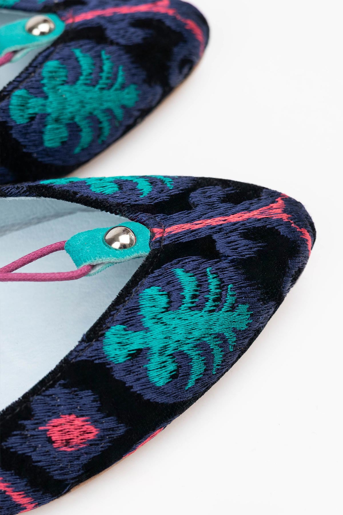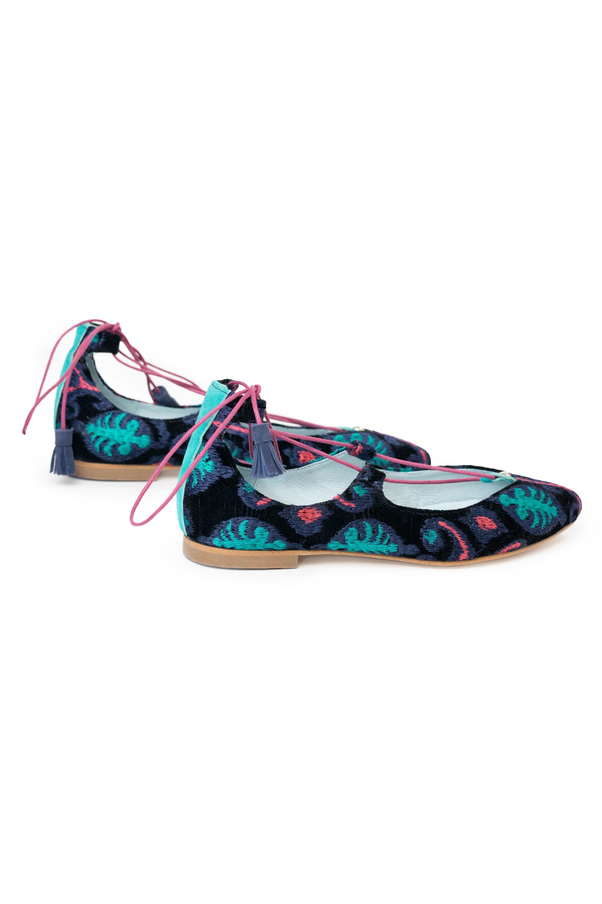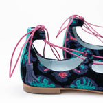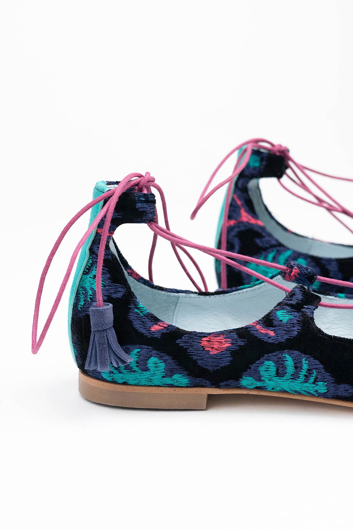 Ballerine annodate alla caviglia con tessuto in velluto di seta nero, ricamate in rosa, viola e verde acqua. Un design super speciale con influenze etniche che conferisce uno stile molto personale al look. Si annodano con lacci di cotone rosa, rifiniti con nappine in camoscio viola. La parte posteriore presenta una vistosa striscia in camoscio verde a contrasto.