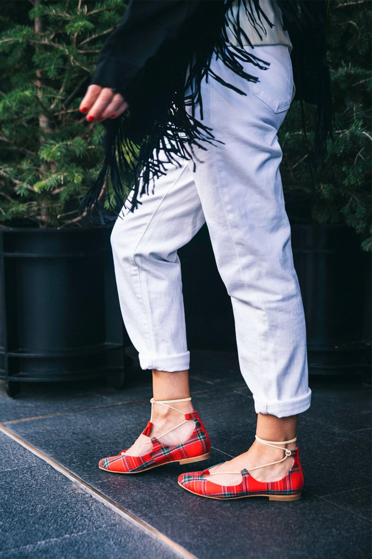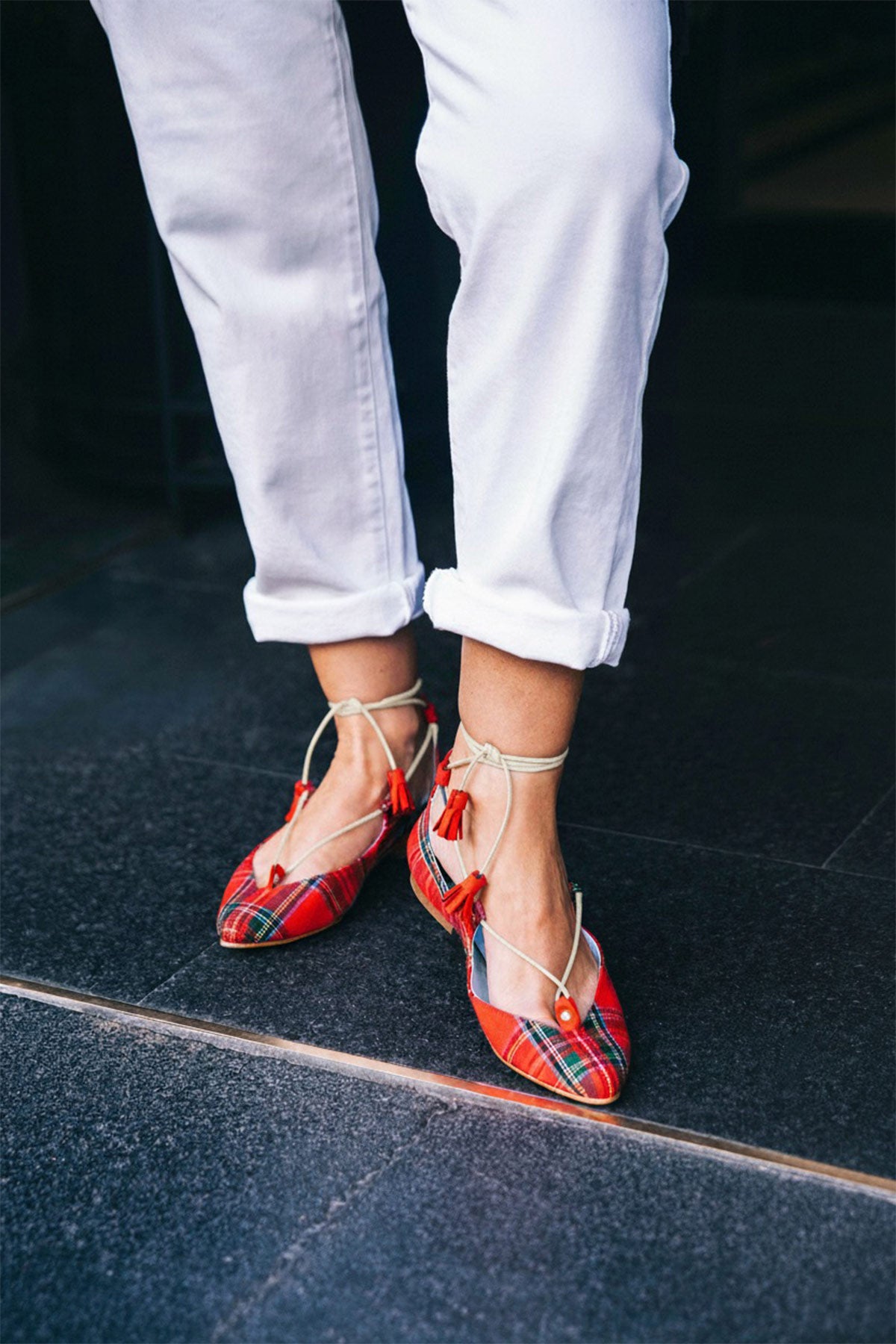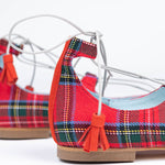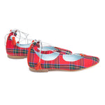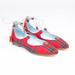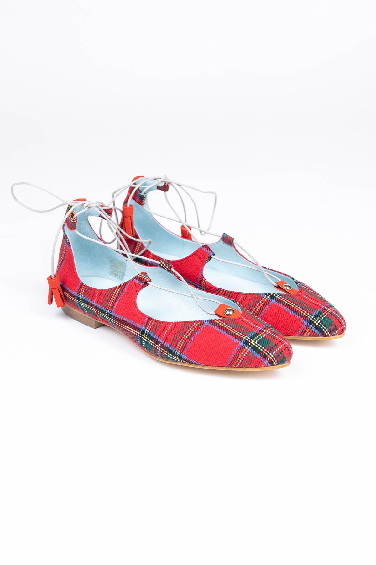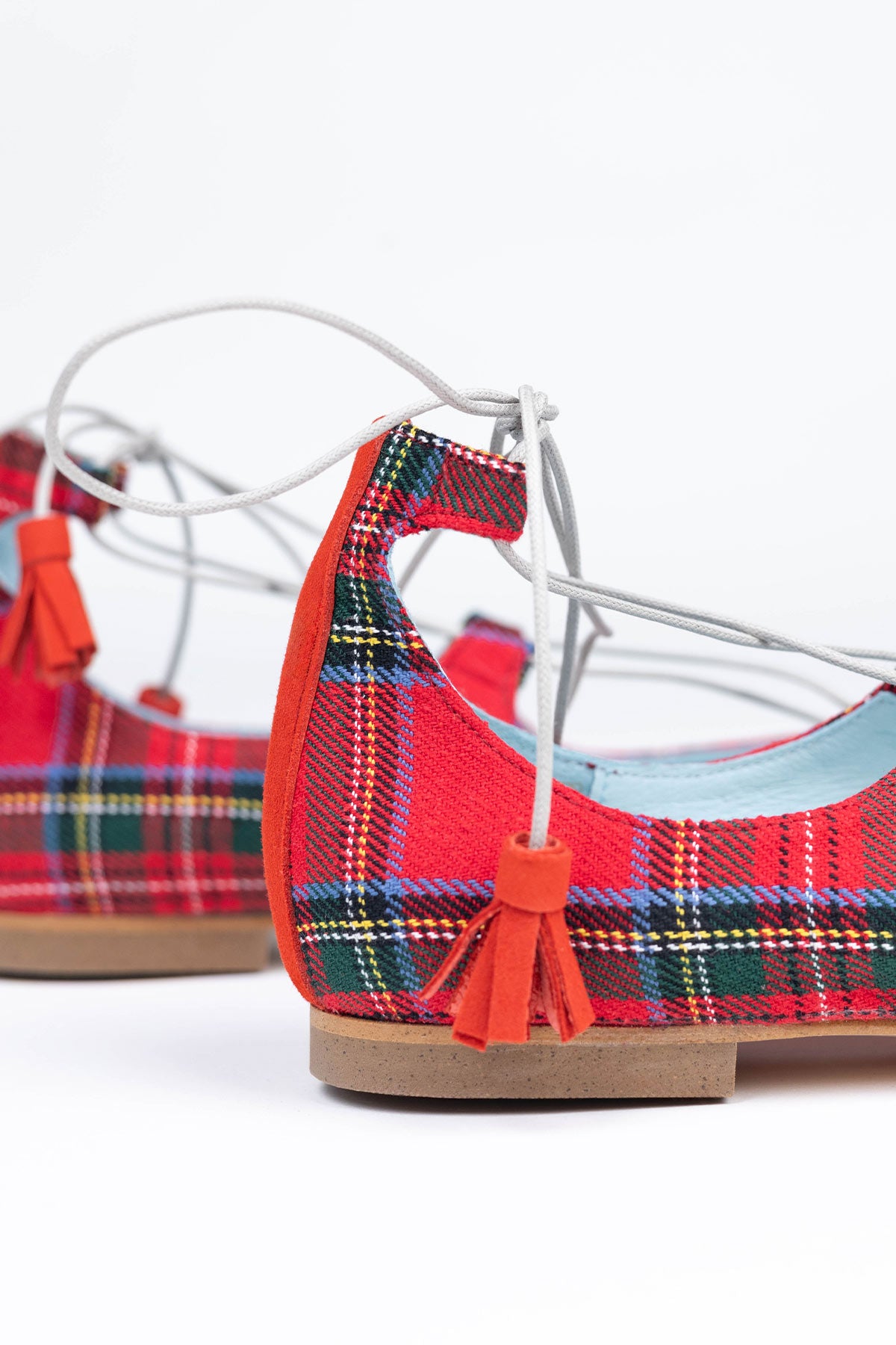 Ballerine di ispirazione scozzese in tessuto tartan, in lana. Con aperture strategiche e annodate alla caviglia, con lacci verdi rifiniti con nappine rosse. Un design classico e molto confortevole, che si adatta a diversi stili. La parte posteriore è rifinita con una striscia di camoscio rosso.