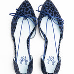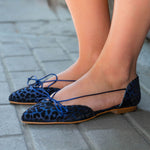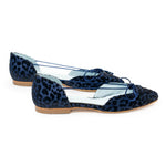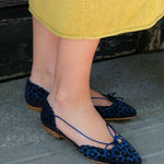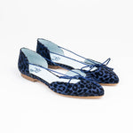 Design con aperture laterali, in raso floccato di colore blu notte. Hanno un cordoncino in raso dello stesso tono, con fiocco frontale. È un design che slancia molto il piede e offre un supporto ottimale. Un capo base per ogni momento, che include una soletta in lana.