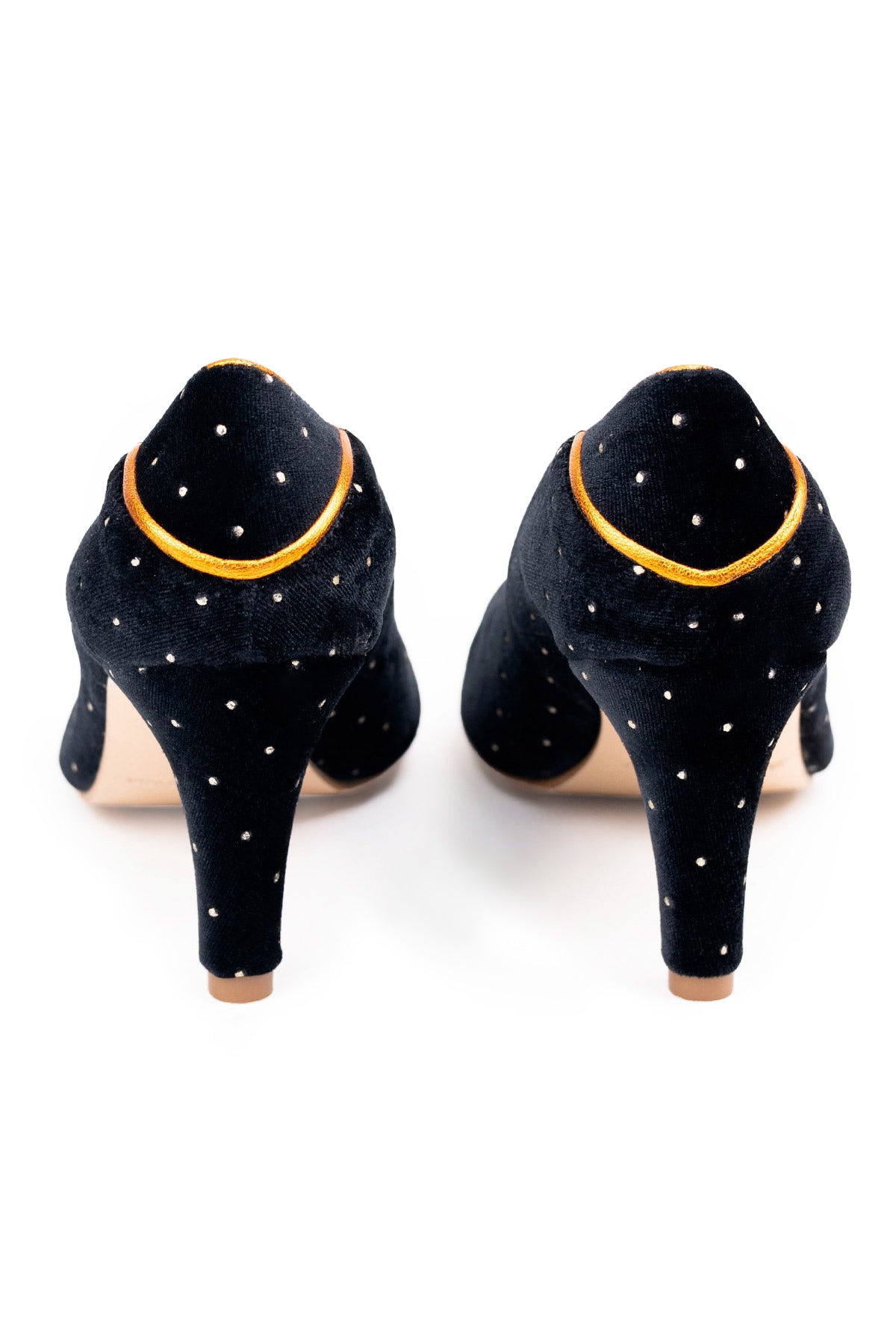 Munich Natrón è un gioiello della corona. Un décolleté classico in velluto nero di seta con applicazioni in argento. Questo design presenta quattro parti ben distinte: punta, lati e tallone, tutti separati da bordi in pelle iridescente, che conferiscono una linea molto elegante e un retro distinto.