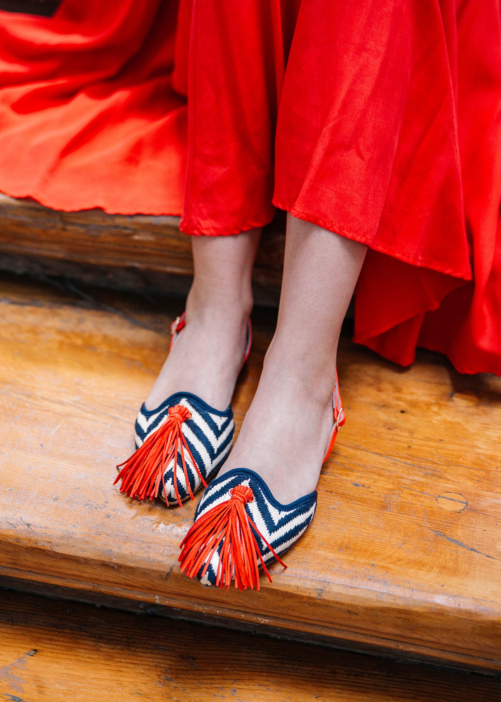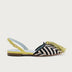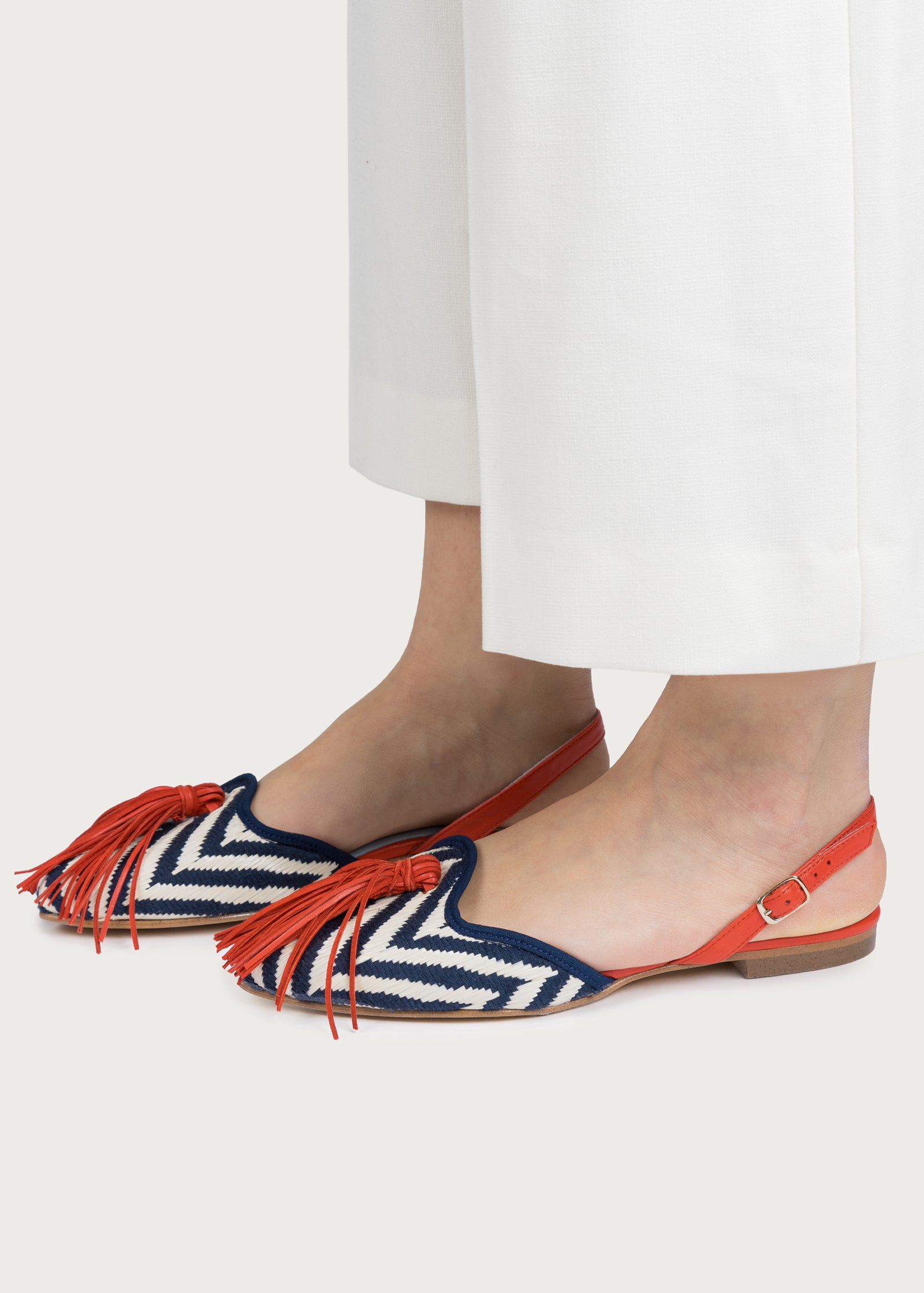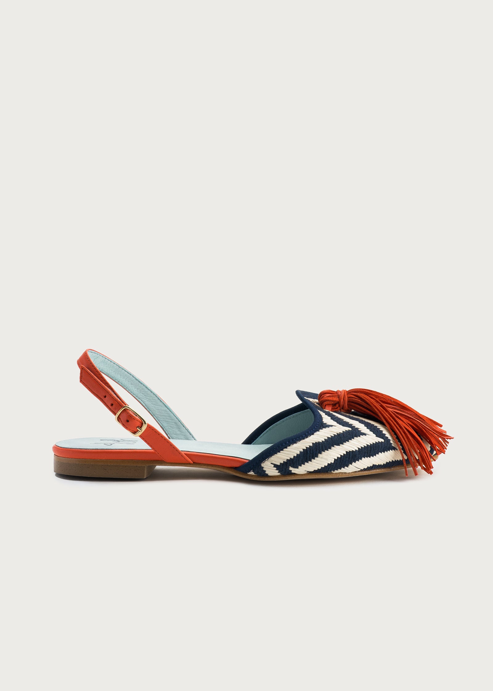 Su parte delantera cerrada destaca por el tejido en patrón zigzag y la borla decorativa en el empeine, un detalle que aporta personalidad y movimiento. La parte trasera abierta incorpora una correa ajustable con hebilla metálica dorada que equilibra estética y funcionalidad. Un modelo versátil y luminoso, perfecto para acompañar los días de verano dentro de la colección SS26 de Defloresyfloreros.