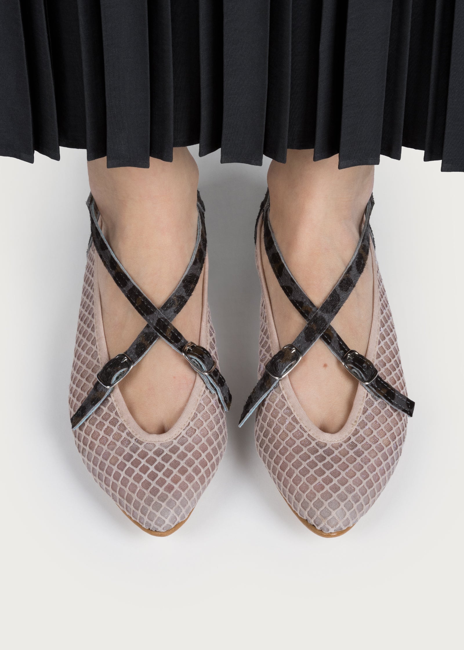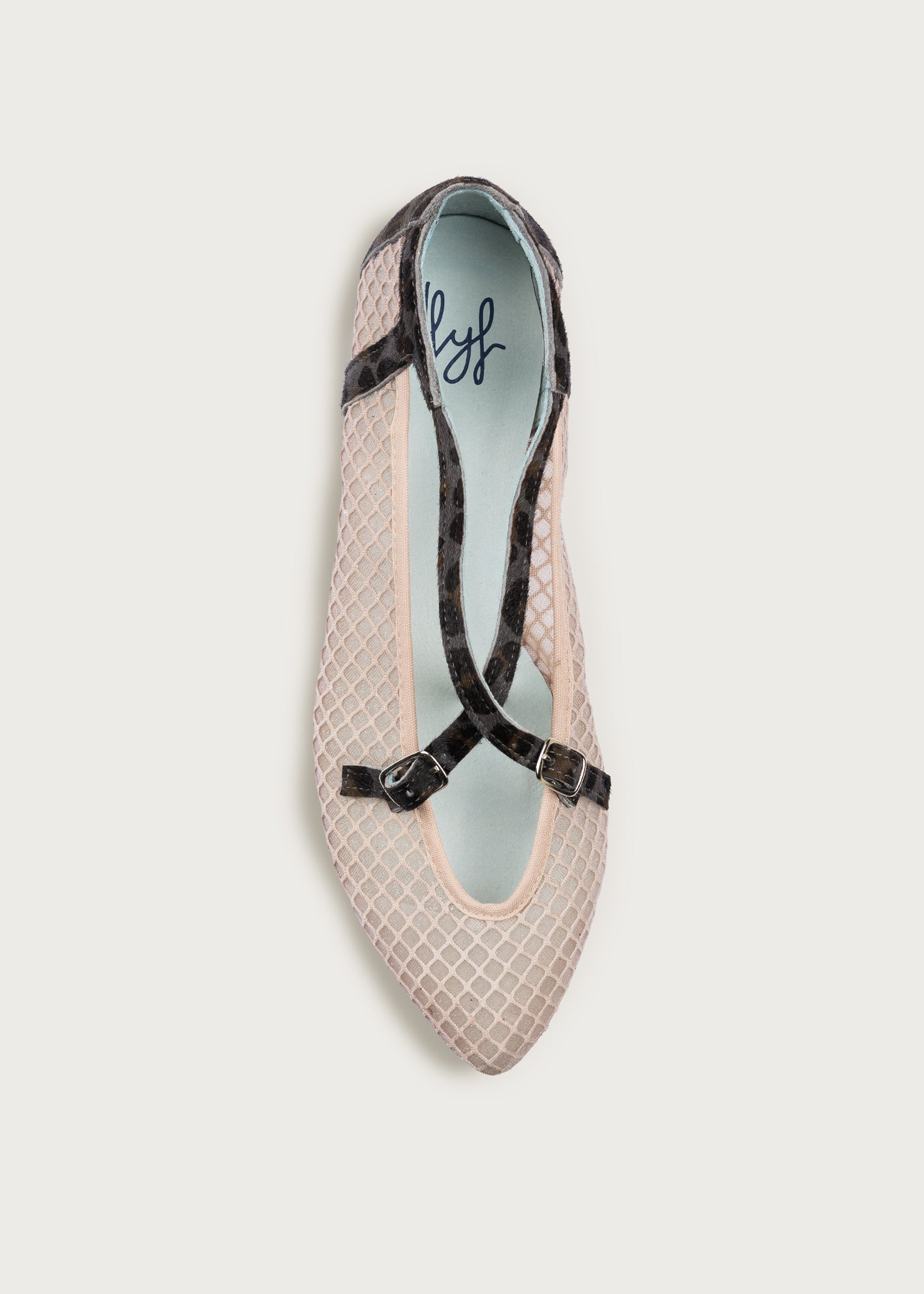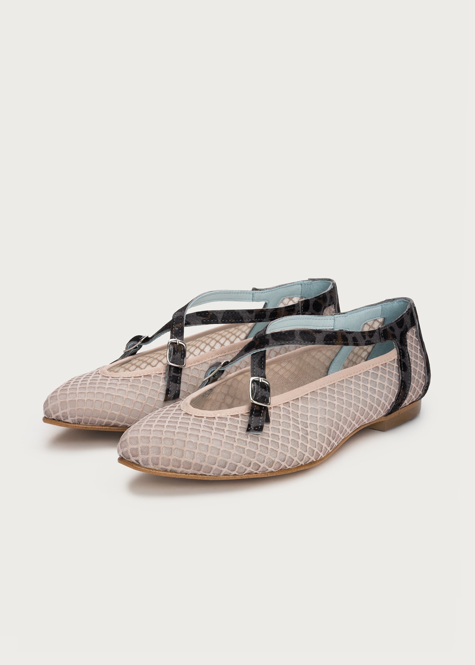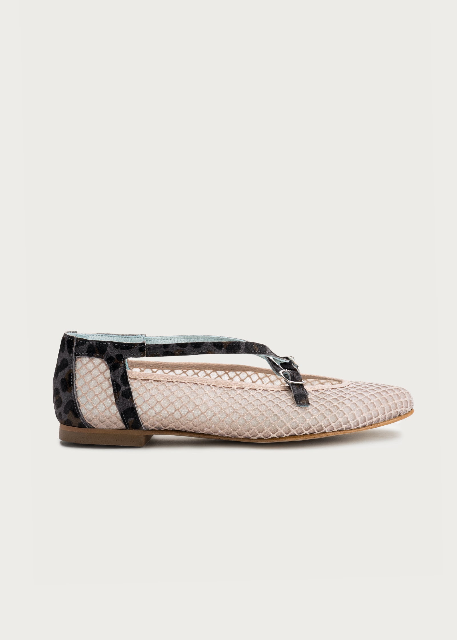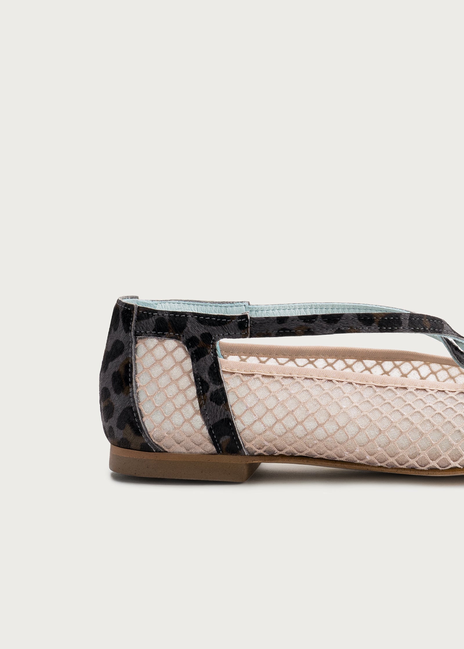 Cosmos es una bailarina de inspiración clásica reinterpretada desde una mirada contemporánea, confeccionada con una cuidada combinación de rejilla y piel con animal print, diseñada y producida de forma artesanal 100% en España. Los materiales han sido seleccionados al detalle por su calidad, ligereza y resistencia, garantizando confort y durabilidad.