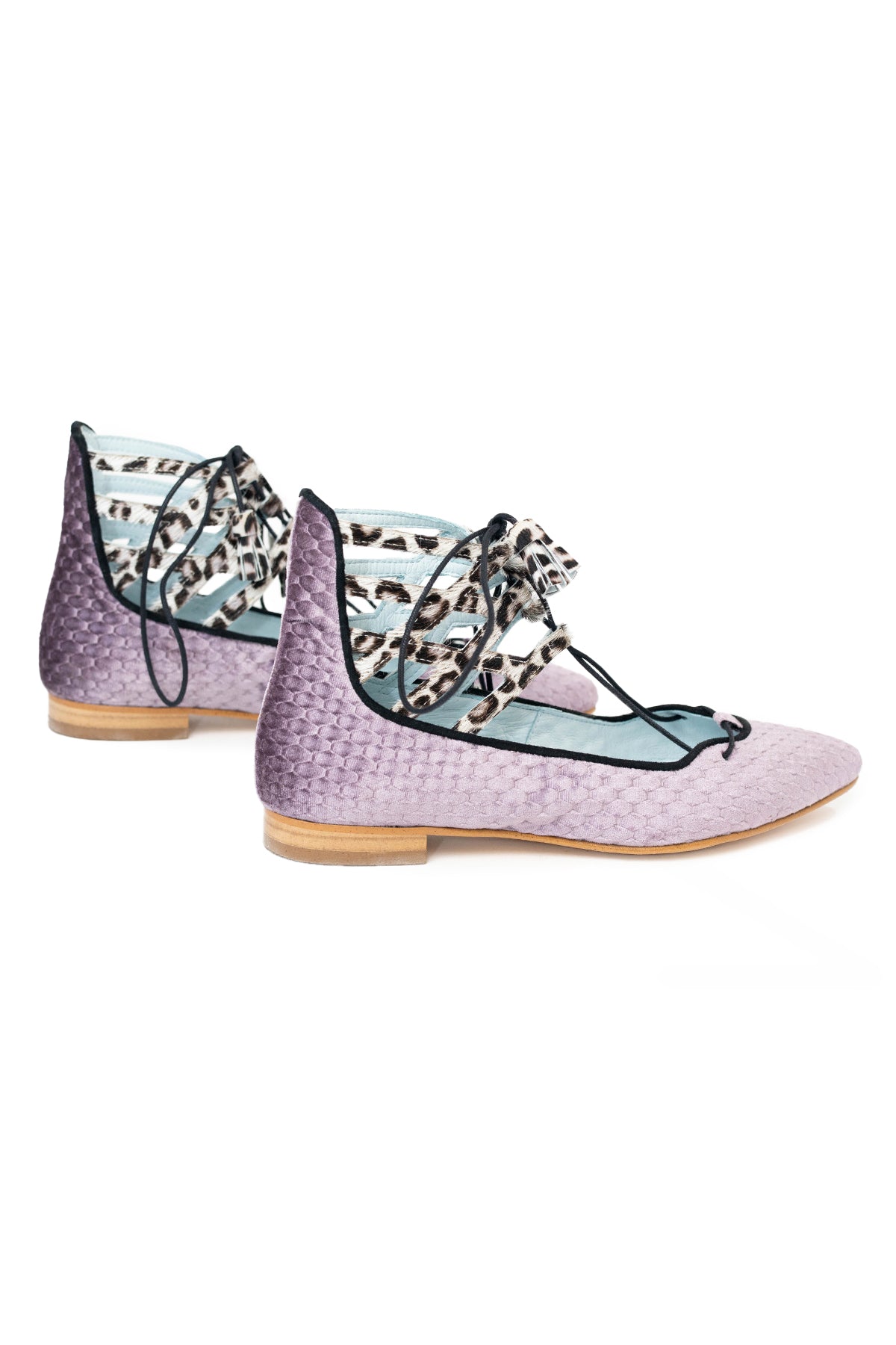 Dublín Mora es un modelo semi-botín que recoge el tobillo con una pieza de piel animal print y va atado en la zona delantera, con un cordón de algodón rematado en borlas. Dublín favorece la silueta del pie por su gran escote delantero y por la pieza del tobillo, con múltiples calados cortados de forma manual, con bisturí, que recoge sin acortar. Una de sus claves es el ribete negro, cosido con precisión y que hace que el zapato favorezca a cualquier tono de piel. El tejido es de terciopelo de seda violeta.