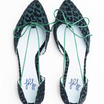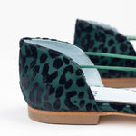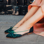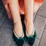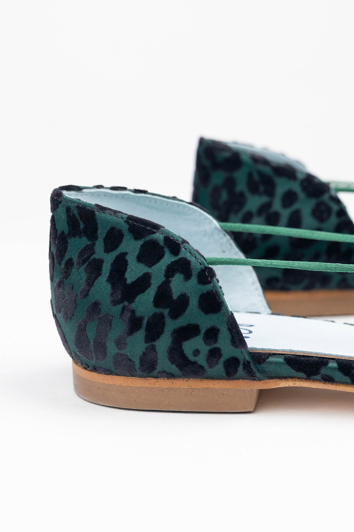 Diseño con aberturas laterales, en raso flocado de color verde botella. Llevan un cordón de cola de ratón en el mismo tono, con lazada delantera. Es un diseño que estiliza mucho el pie y aporta una sujeción óptima. Un básico para cualquier momento, que incluye plantilla de lana.