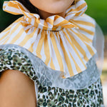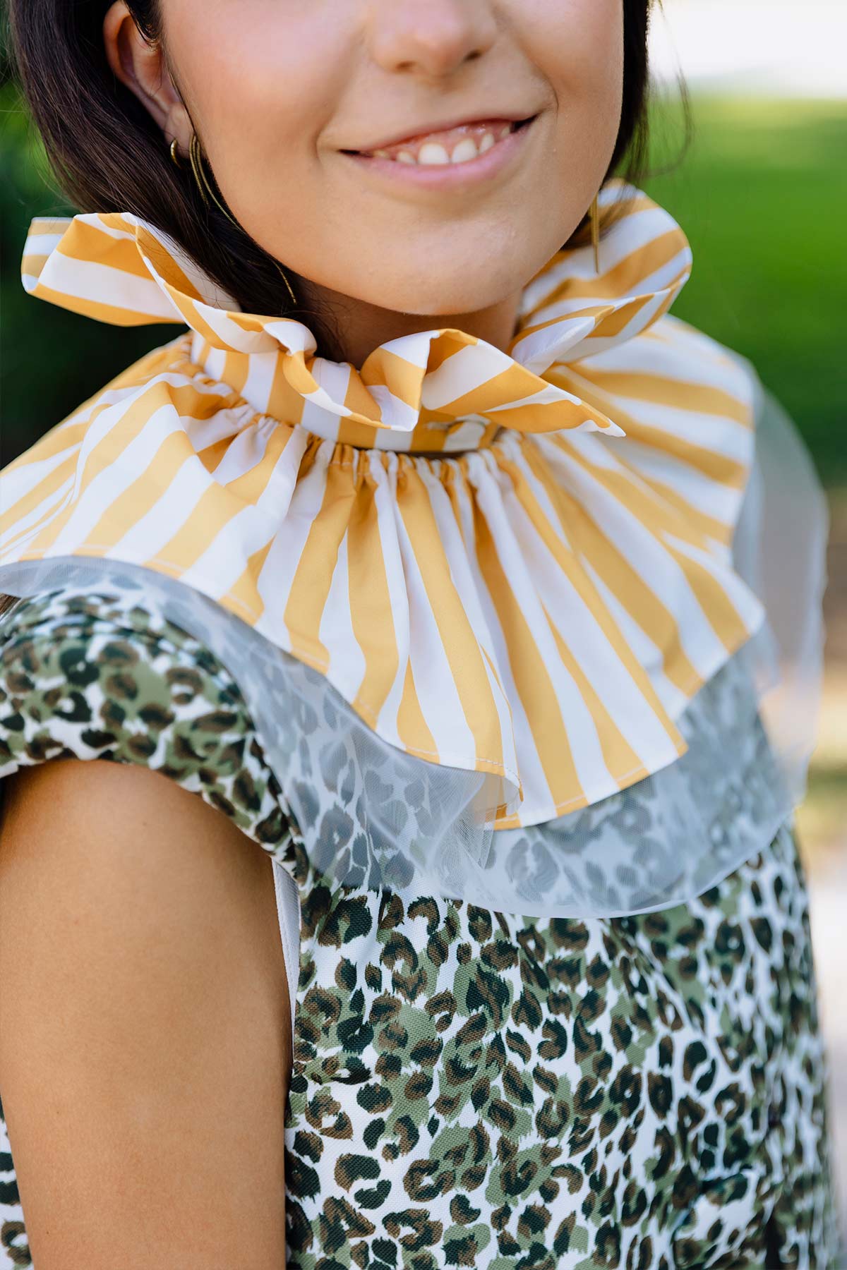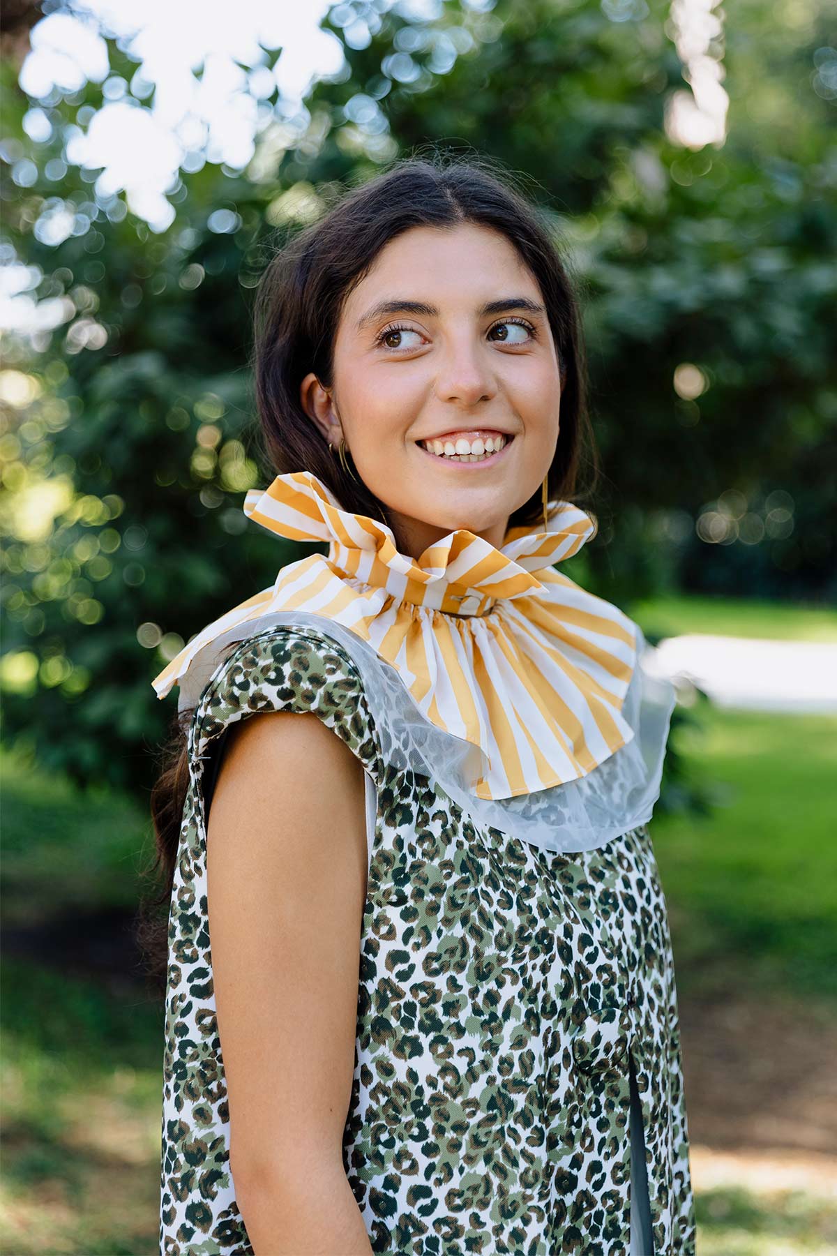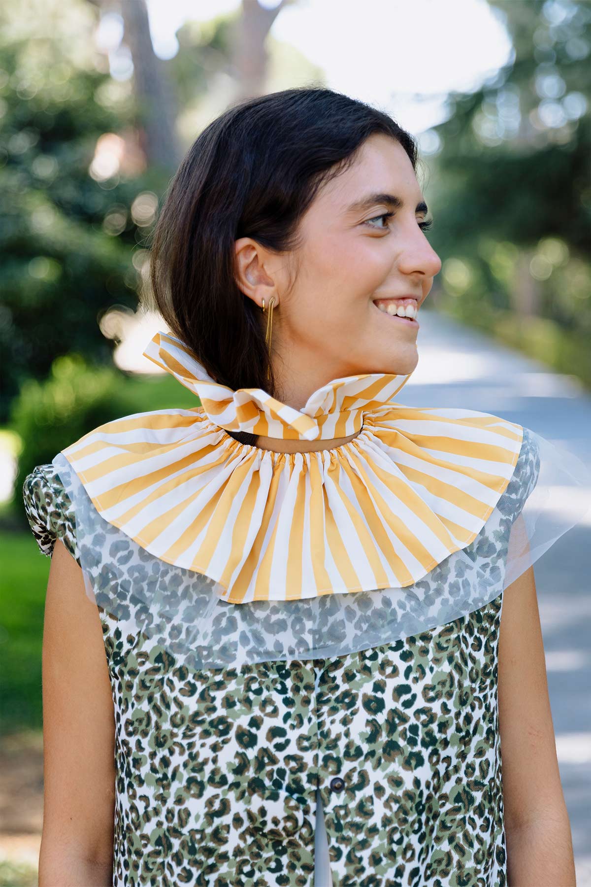 Cuello diseñado y confeccionado 100% en nuestros talleres de España. Es desmontable y se compone de dos piezas: cuello bajo con volante sobre tul blanco y mini cuello superior con cierre de botón. Está elaborado en raso y es un 2x1 súper versátil que aporta carácter a tus looks de temporada.