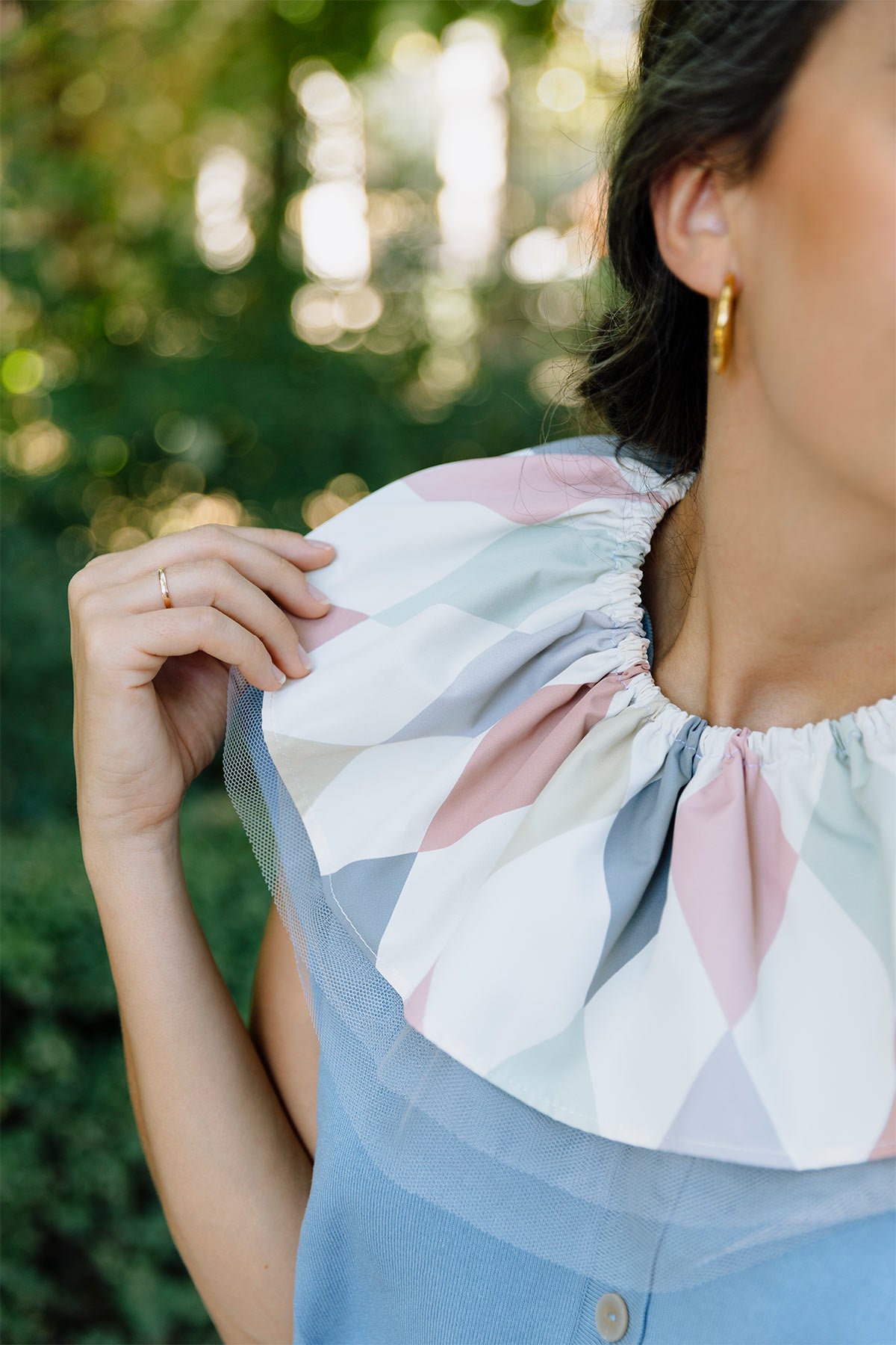 Cuello diseñado y confeccionado 100% en nuestros talleres de España. Es desmontable y se compone de dos piezas: cuello bajo con volante sobre tul de colores y mini cuello superior con cierre de botón. Está elaborado en raso y es un 2x1 súper versátil que aporta carácter a tus looks de temporada.
