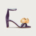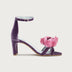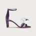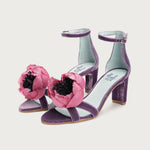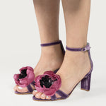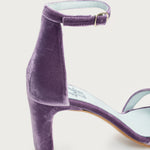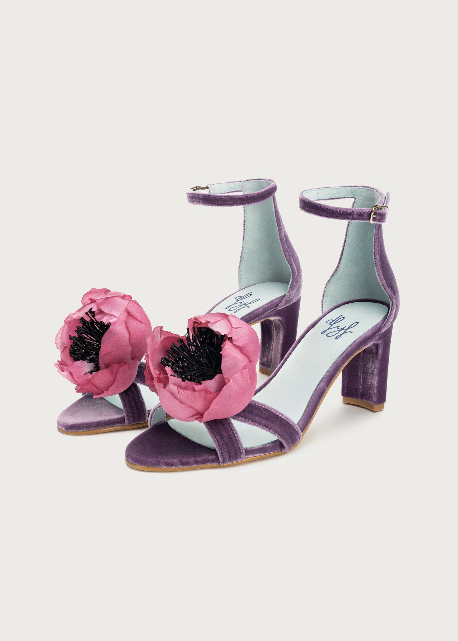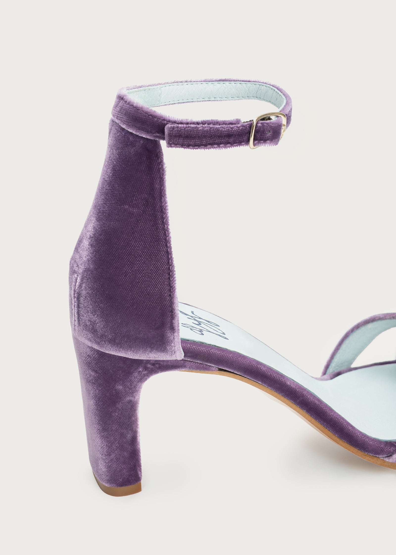 Sandalia de terciopelo de seda, con tacón de 6,5 cm. de altura, pulsera en el tobillo y tiras cruzadas en pala.