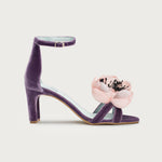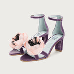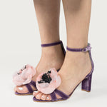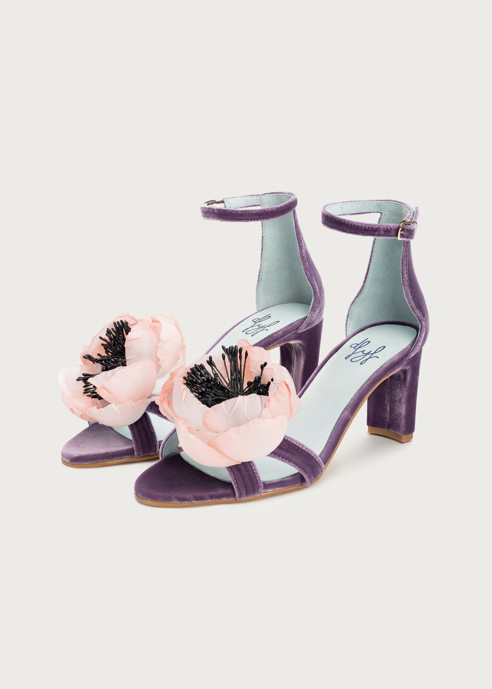 Sandalia de terciopelo de seda, con tacón de 6,5 cm. de altura, pulsera en el tobillo y tiras cruzadas en pala.