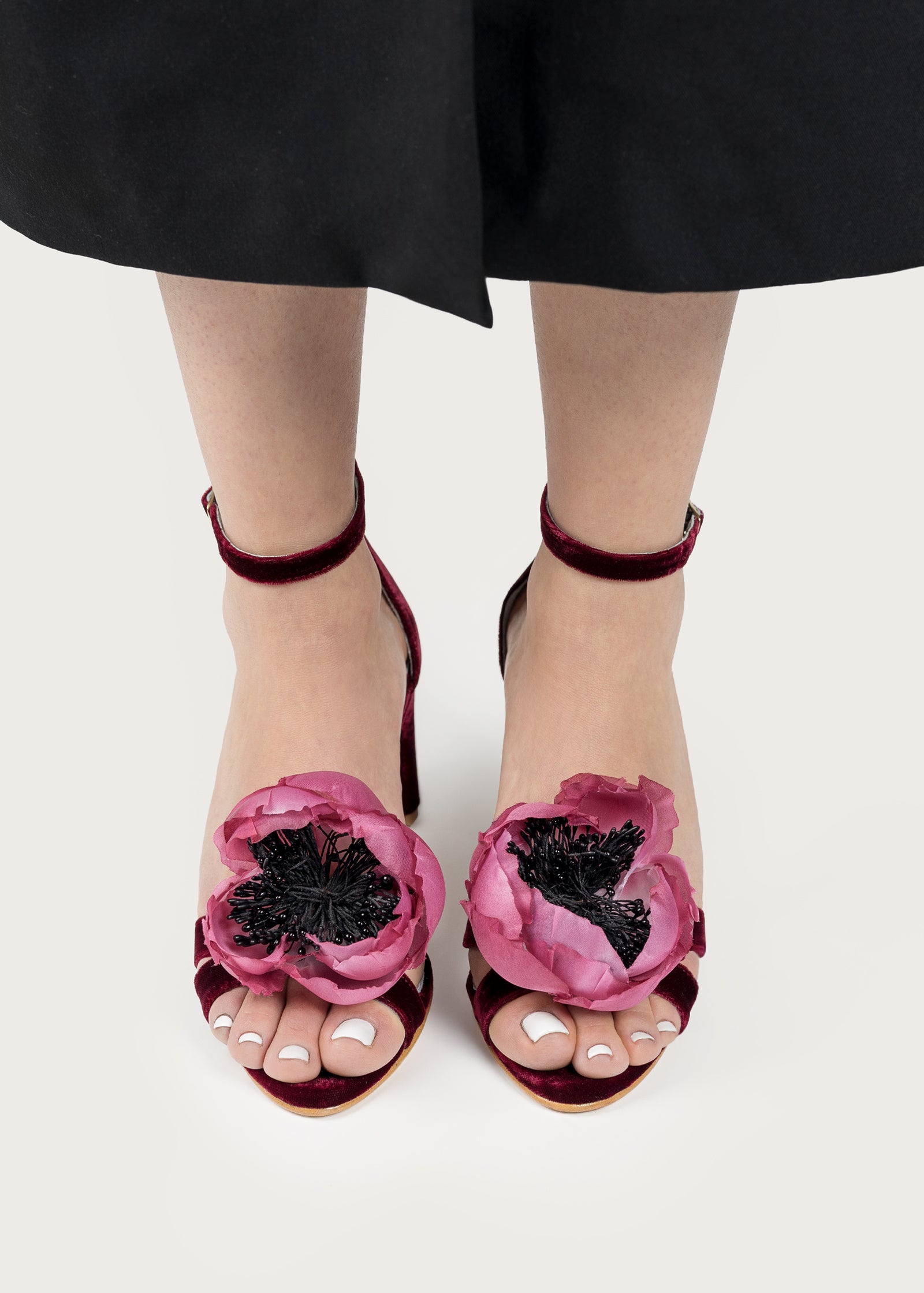 Sandalia de terciopelo de seda, con tacón de 6,5 cm. de altura, pulsera en el tobillo y tiras cruzadas en pala.