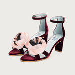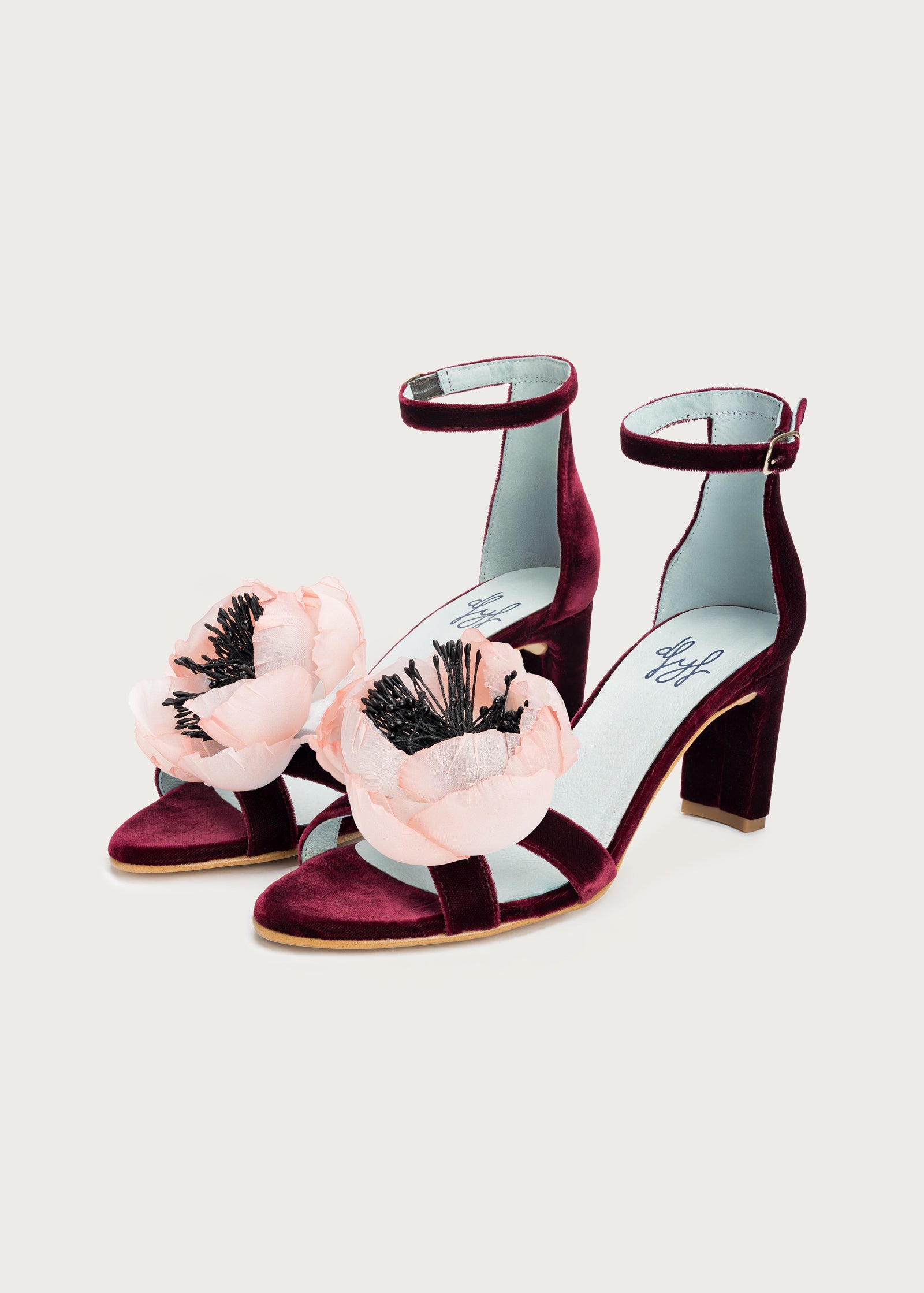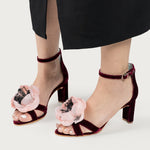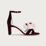 Sandalia de terciopelo de seda, con tacón de 6,5 cm. de altura, pulsera en el tobillo y tiras cruzadas en pala.