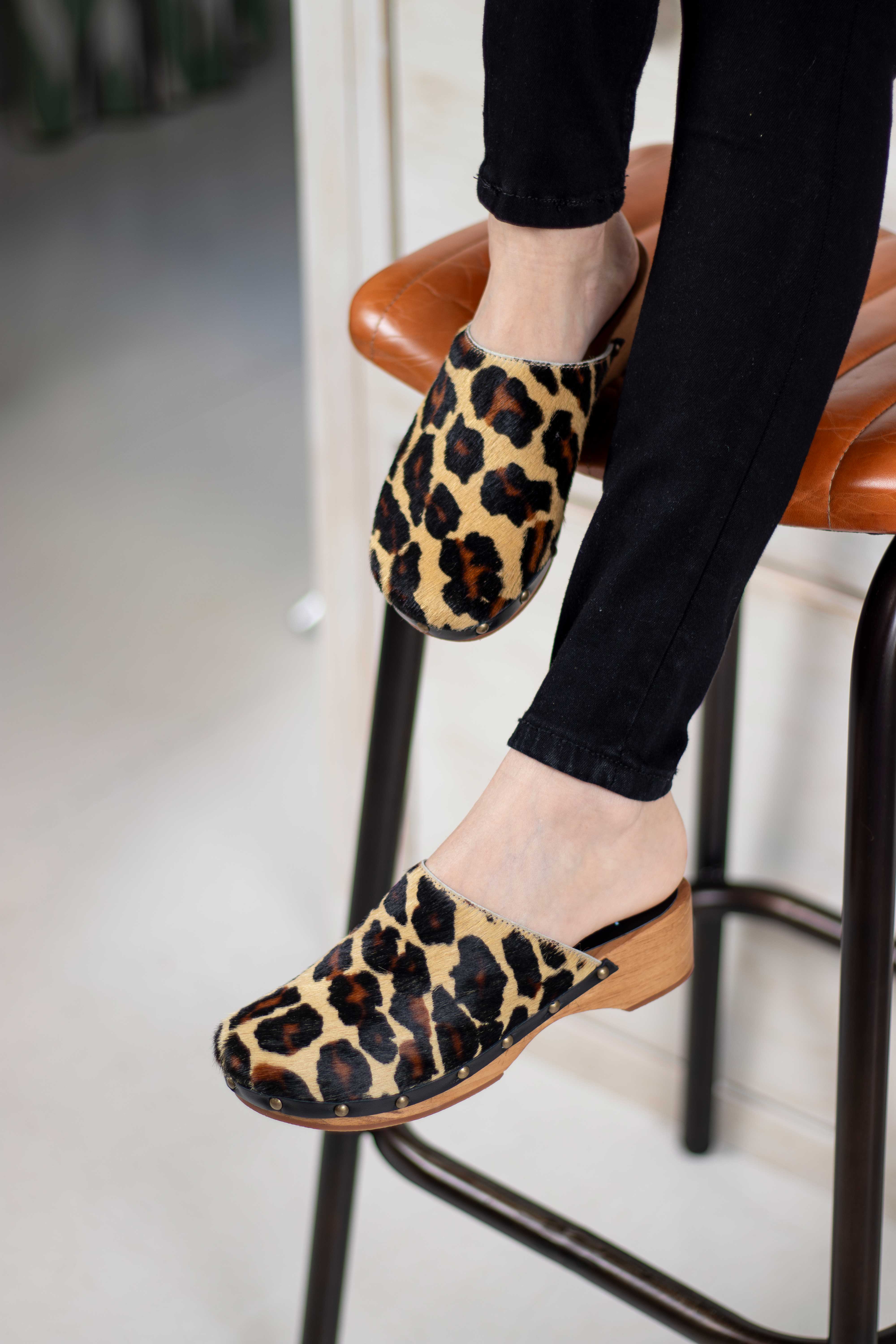 Zueco de pelo animal print y tachuelas hechas a mano, talonera de piel y suela de madera con goma para evitar resbalones, con tacón de 3,5 cm de altura. Modelo exclusivo de De Flores y Floreros, diseñado y fabricado en España.