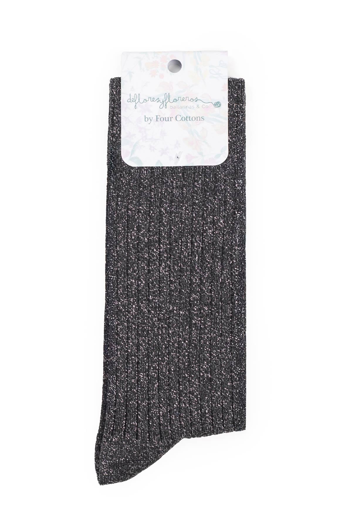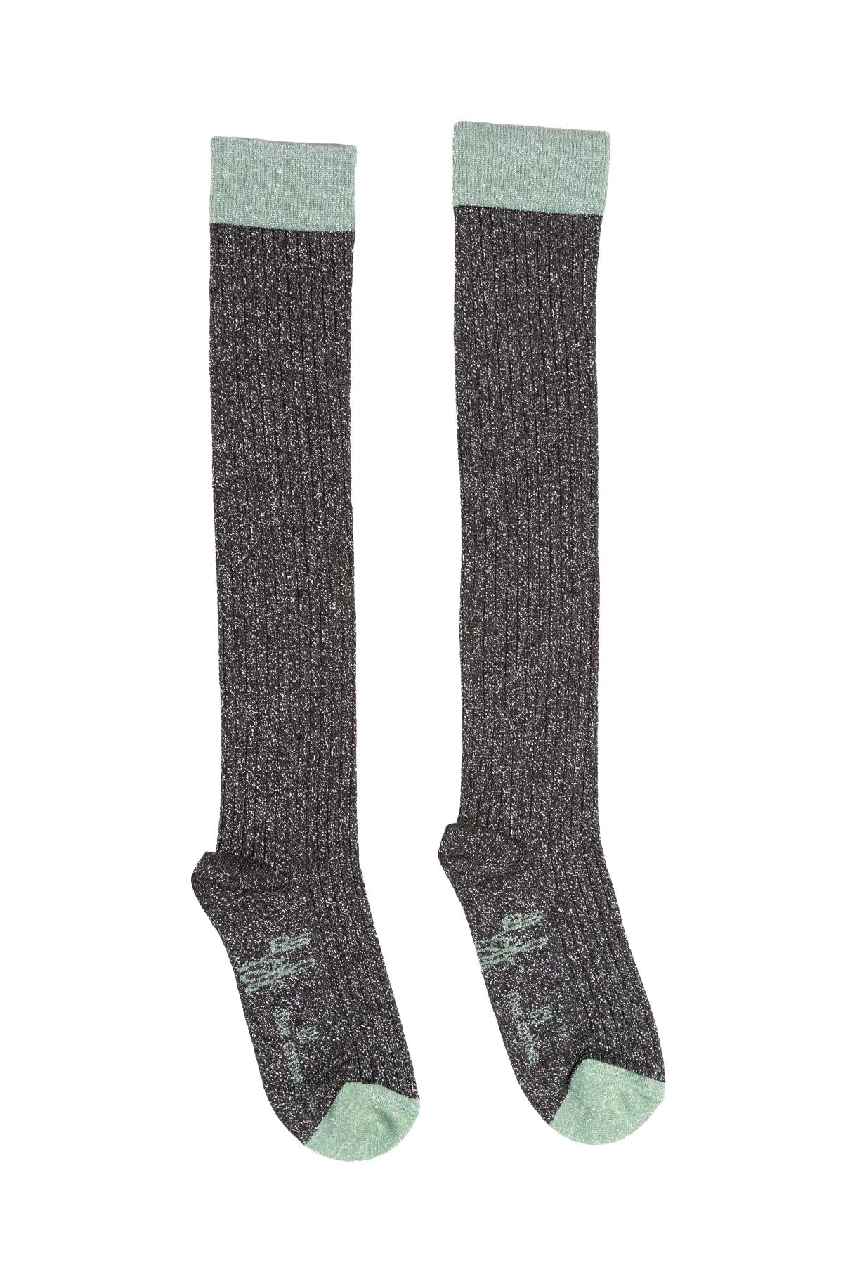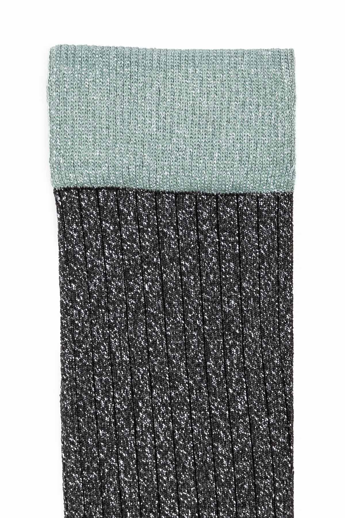 Meia de algodão de cano alto bicolor. Design com biqueira e faixa da mesma cor e glitter.