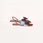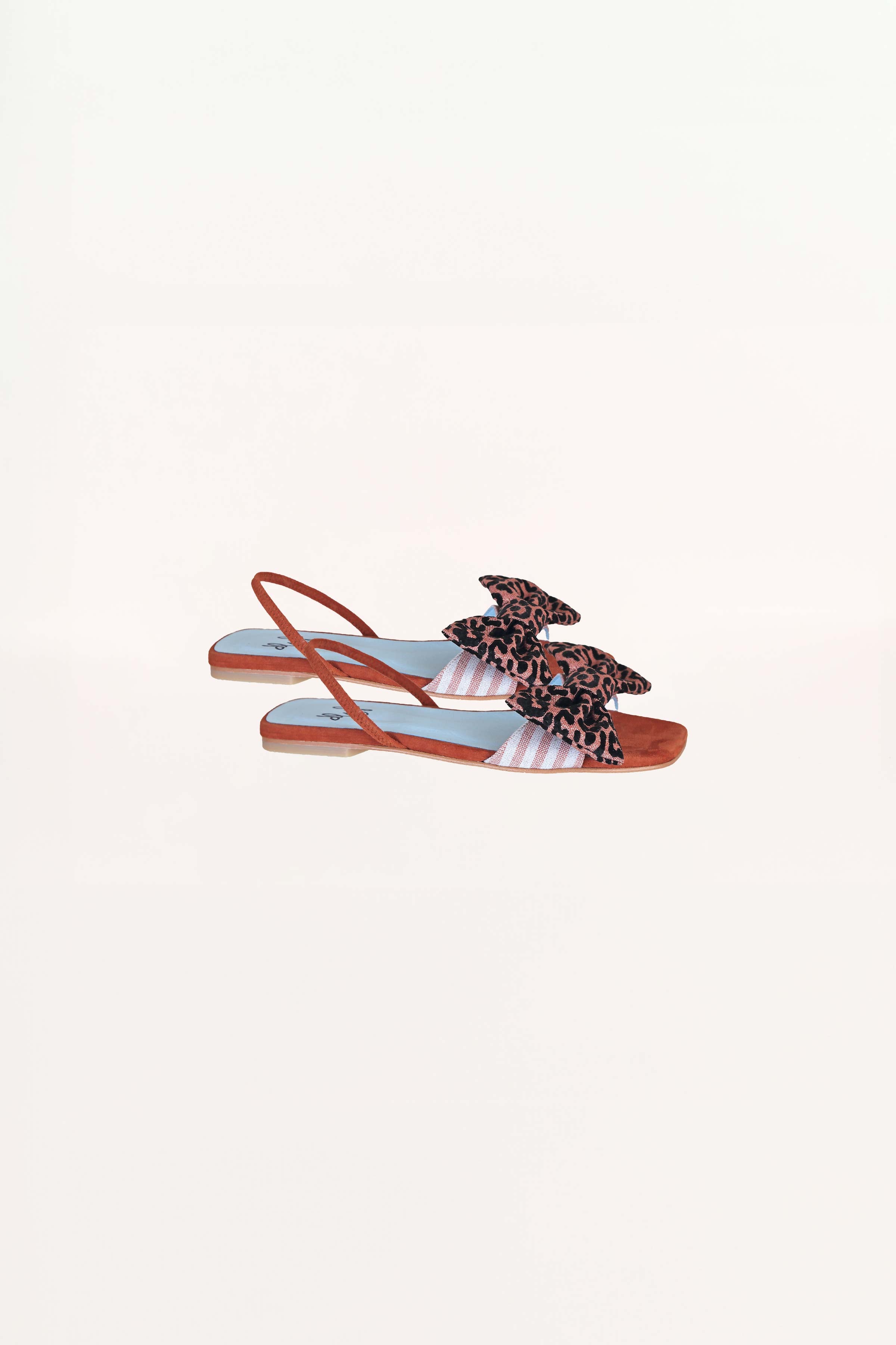 Sandália plana tipo pala com fecho traseiro em tira de camurça para evitar que o pé escorregue e maxi laço estampado na parte da frente. Interior 100% pele. Sola de couro. Modelo exclusivo da defloresyfloreros, desenhado e fabricado em Espanha.