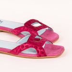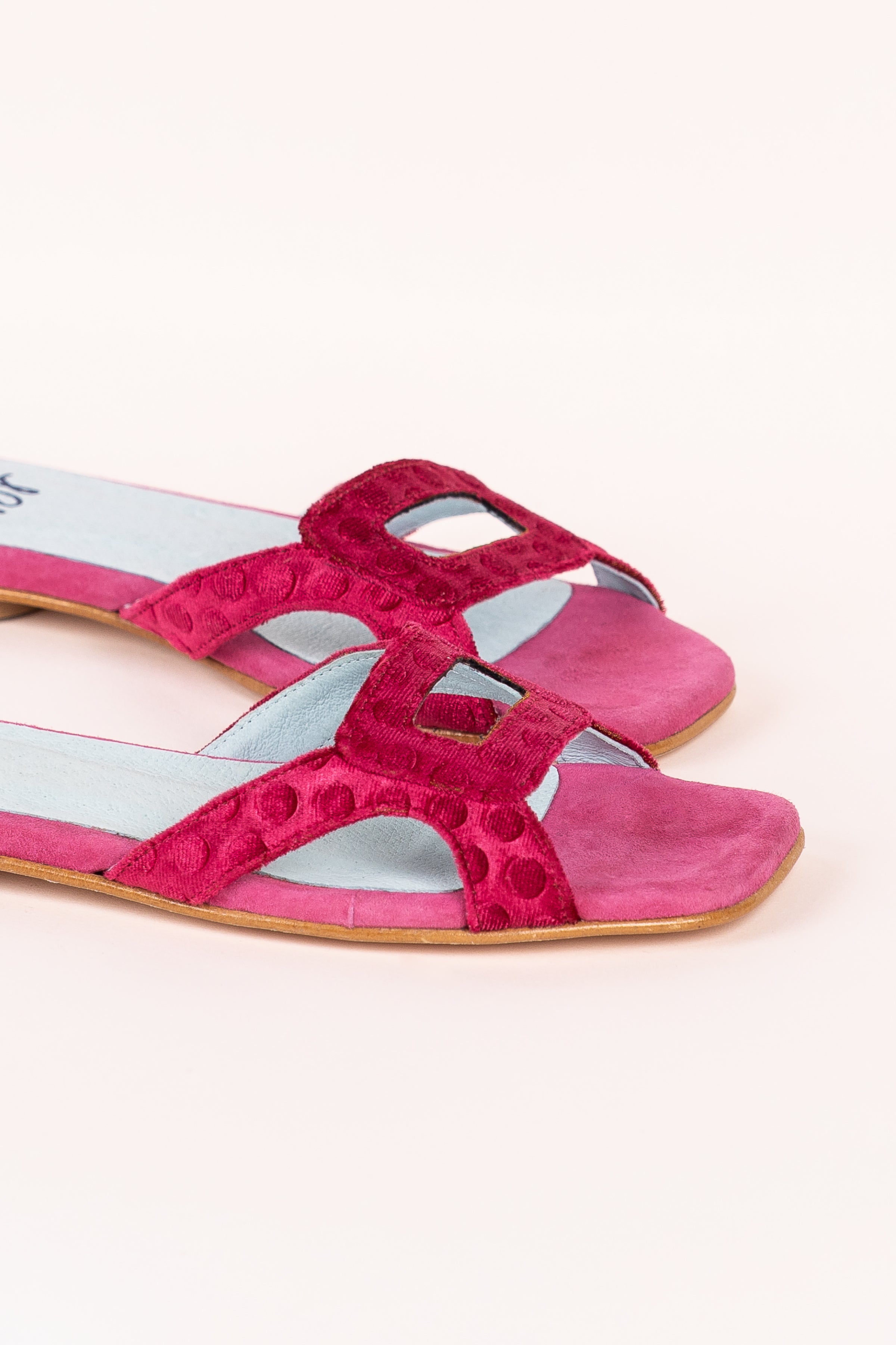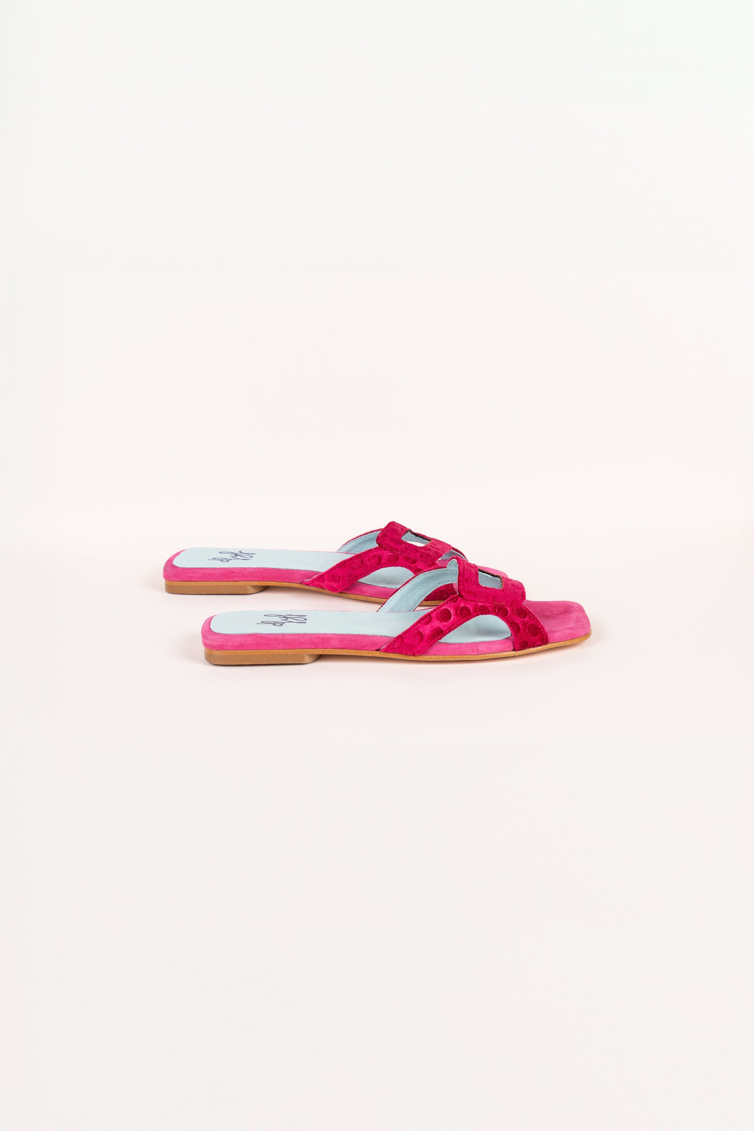 Tamanho pequeno, recomendamos um tamanho maior que o habitual * Sandália de veludo de seda estampada com bolinhas com aberturas estratégicas. Sola de couro. Modelo exclusivo da defloresyfloreros, desenhado e fabricado na Espanha.