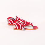 Eles esculpem algo amplo. Sandália rasteira com base vermelha composta por tiras de glitter prateadas finalizadas com franjas vermelhas.