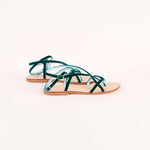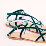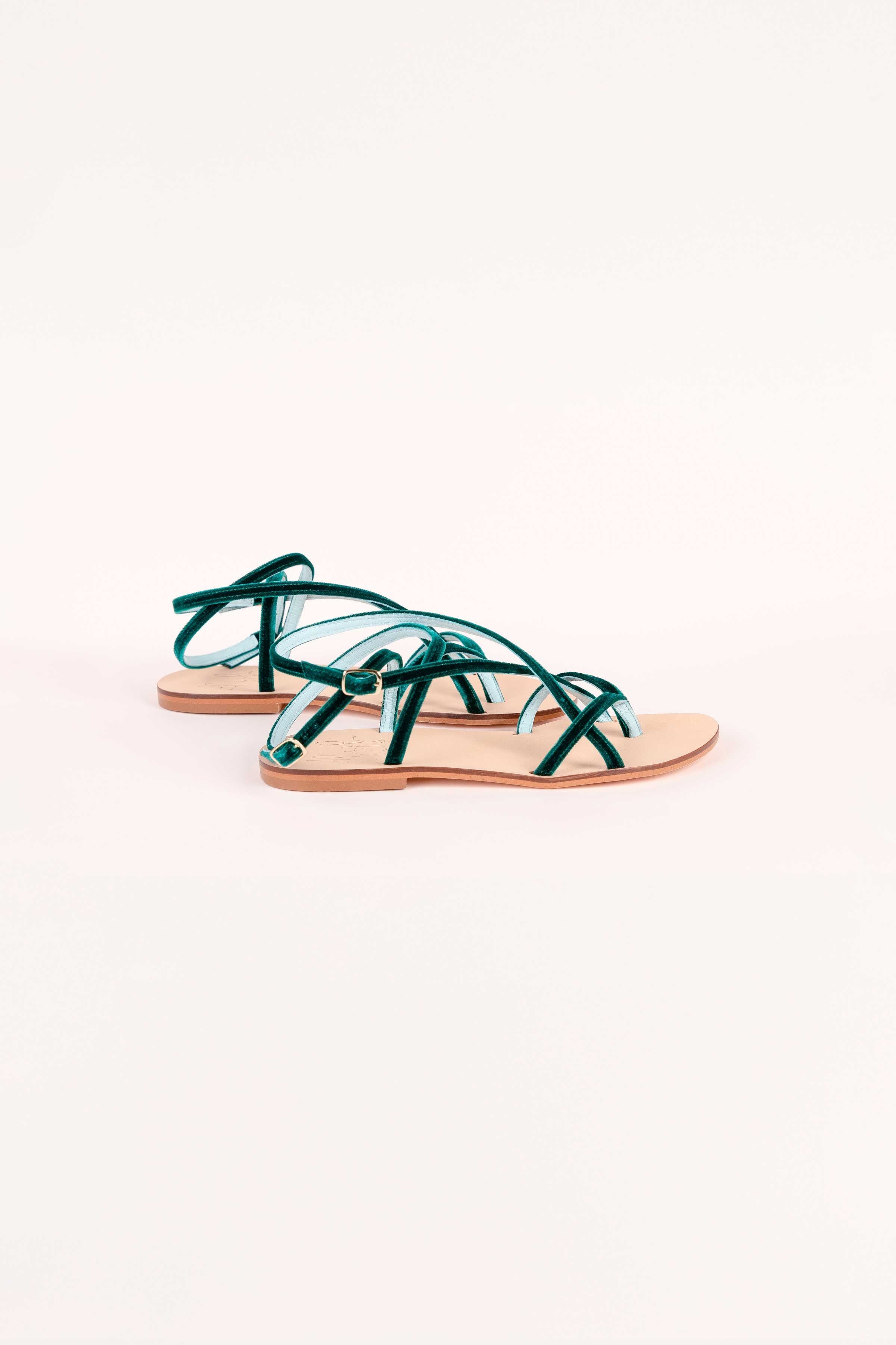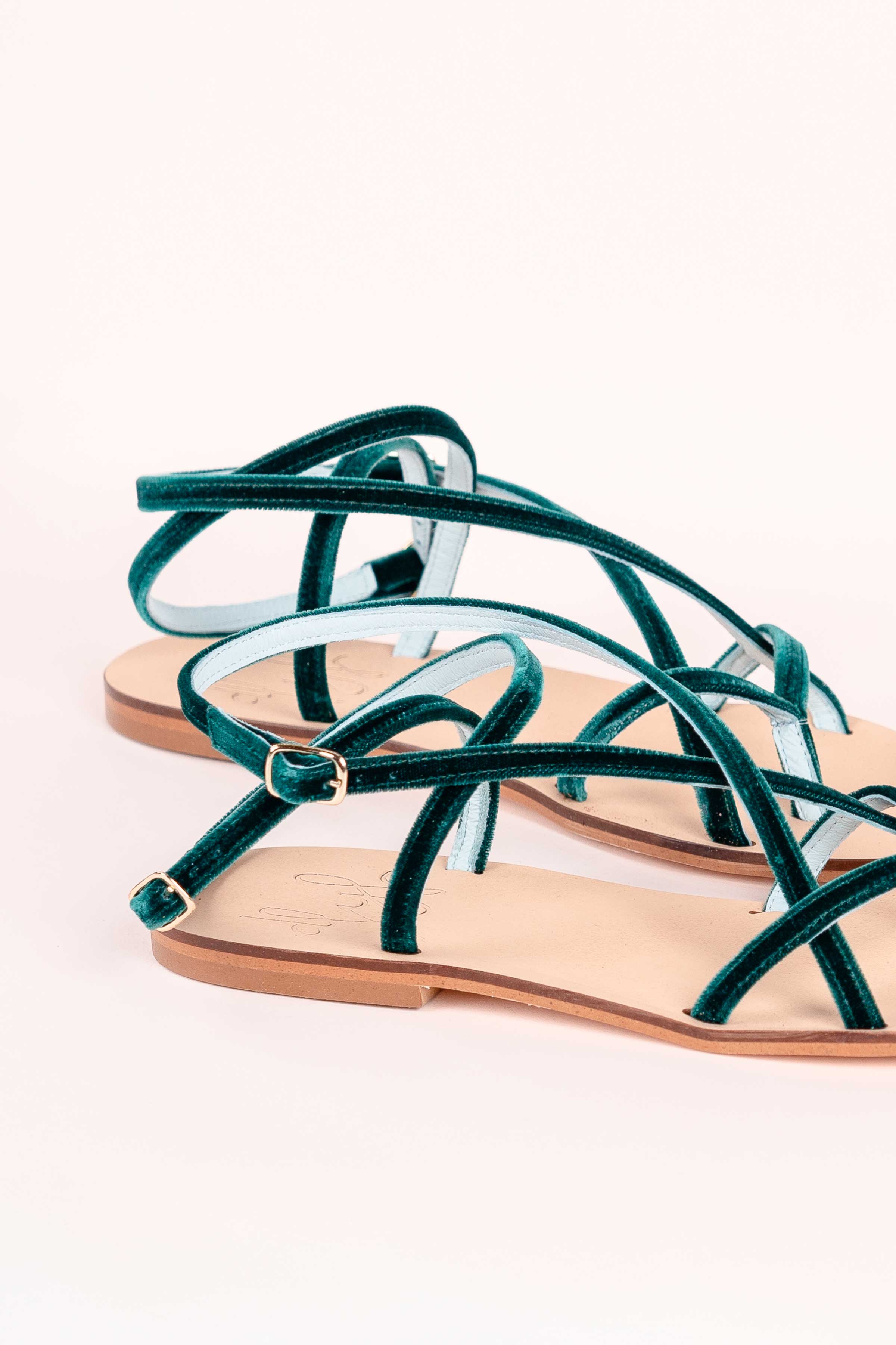 Sandália esclava de tiras em veludo de seda verde garrafa • Interior 100% pele • Made in Spain. Sola de couro. Modelo exclusivo de defloresyfloreros, desenhado e fabricado em Espanha.