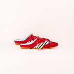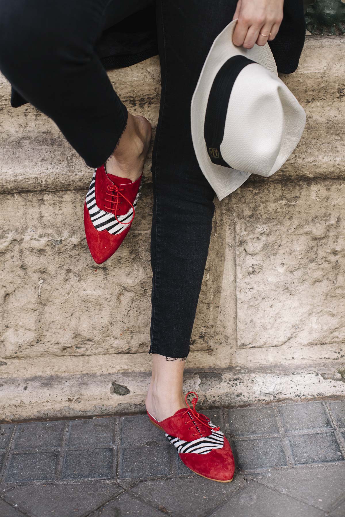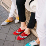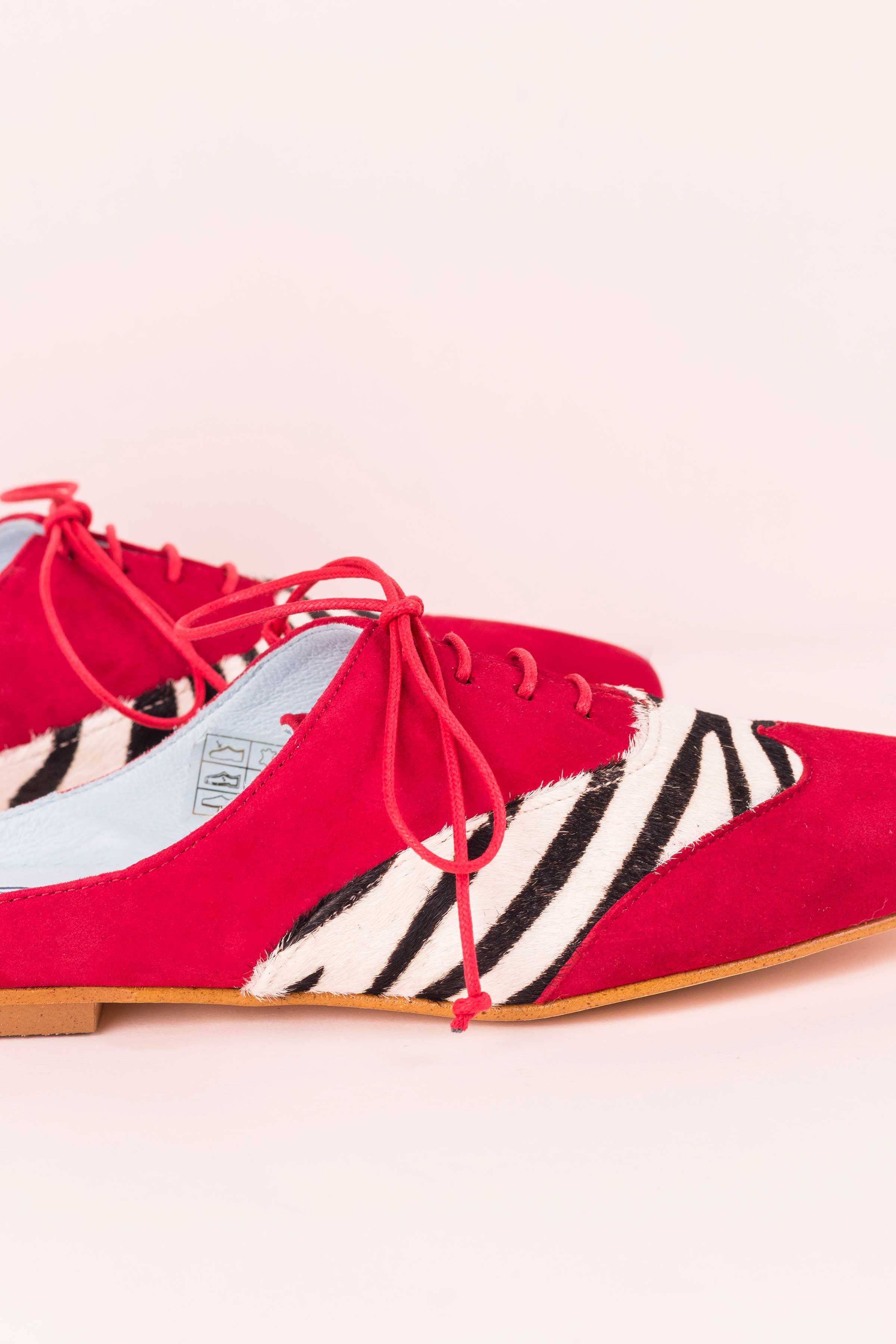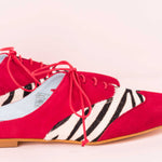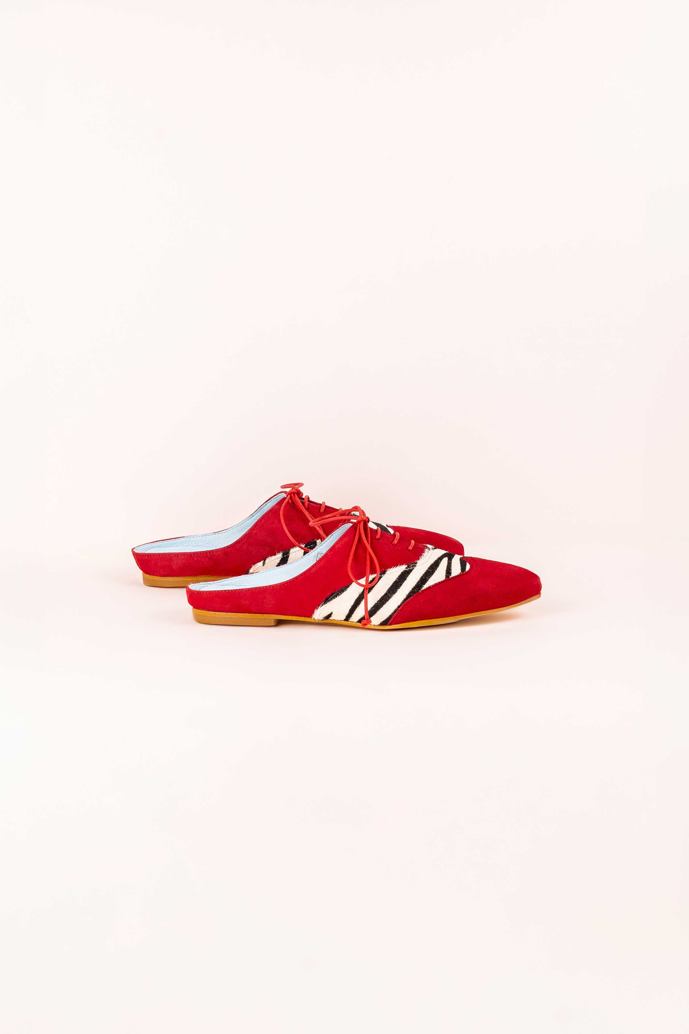 Mule combinado em camurça e estampa de zebra. Interior em couro azul claro. Sola de couro. Modelo exclusivo da defloresyfloreros, desenhado e fabricado na Espanha.
