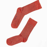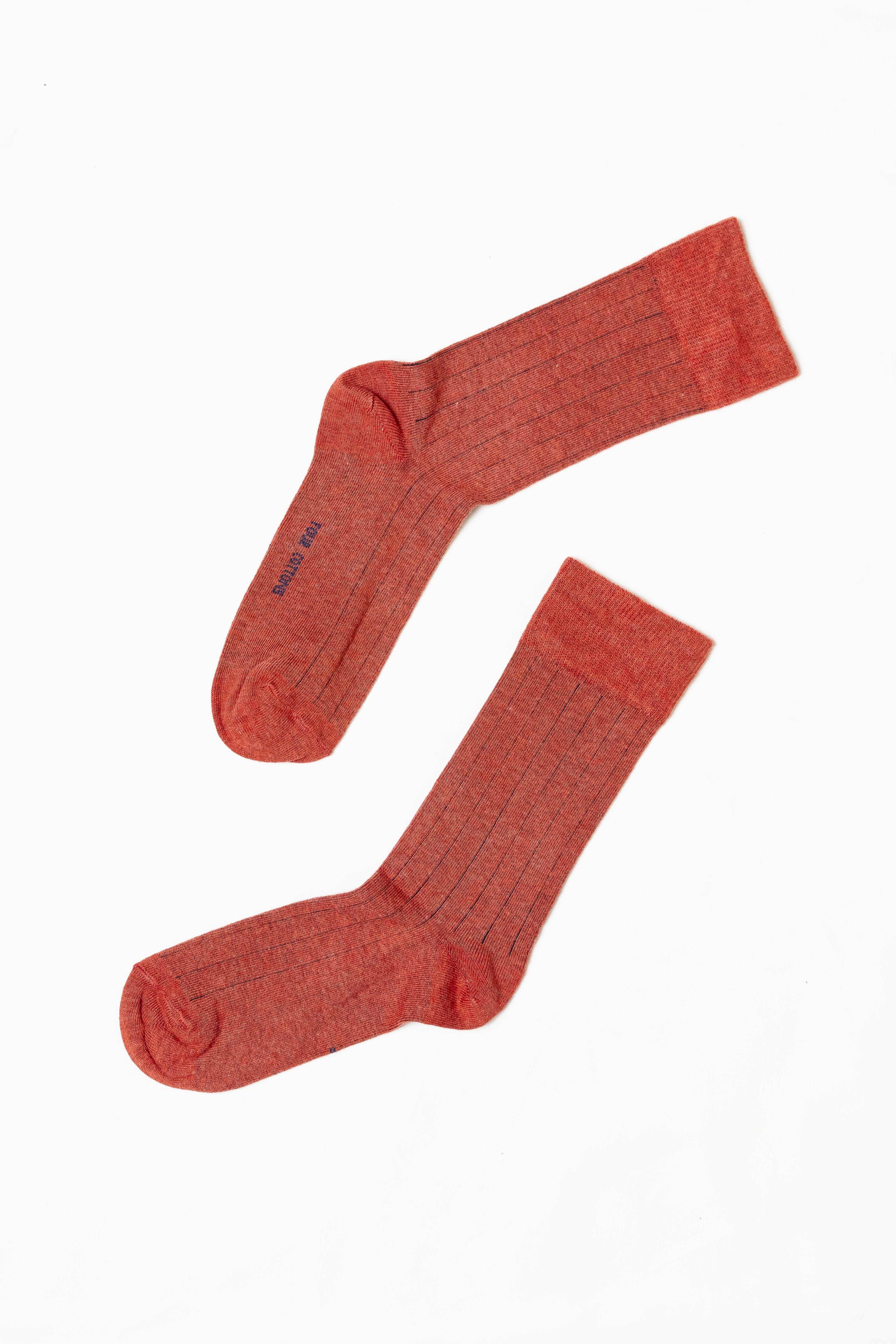 Meia de algodão de corte médio com borracha que se ajusta perfeitamente sem marcar a pele. Em tom laranja e microfaixa cinza.