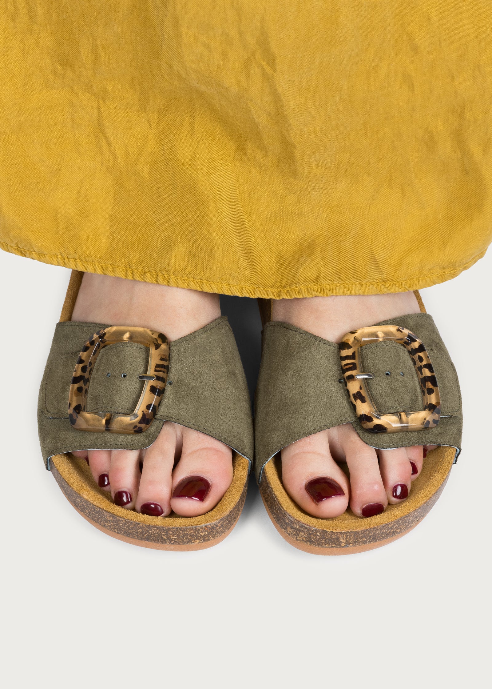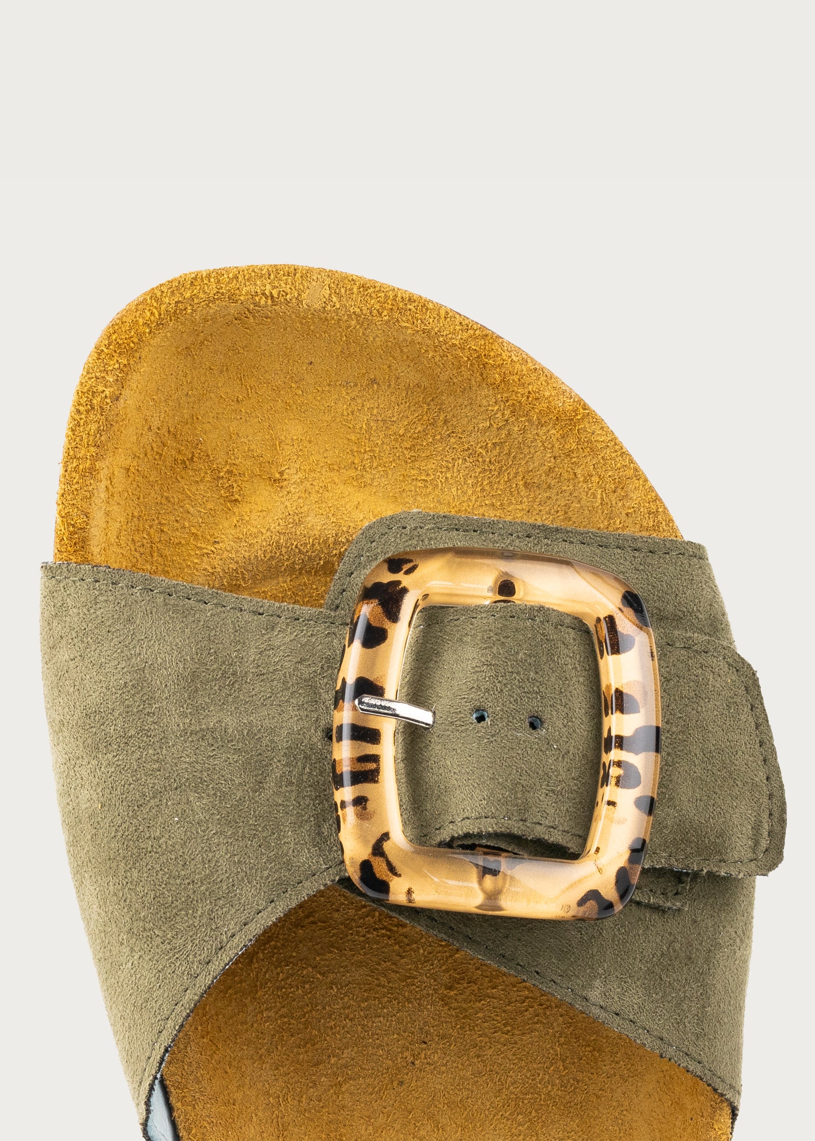 Su diseño destaca por la combinación de animal print con hebilla de resina, aportando un punto contemporáneo y distintivo. Las piezas geométricas se entrelazan en la parte delantera creando una composición equilibrada, mientras que el atado con cordón de algodón y las borlas a contraste refuerzan su esencia desenfadada.